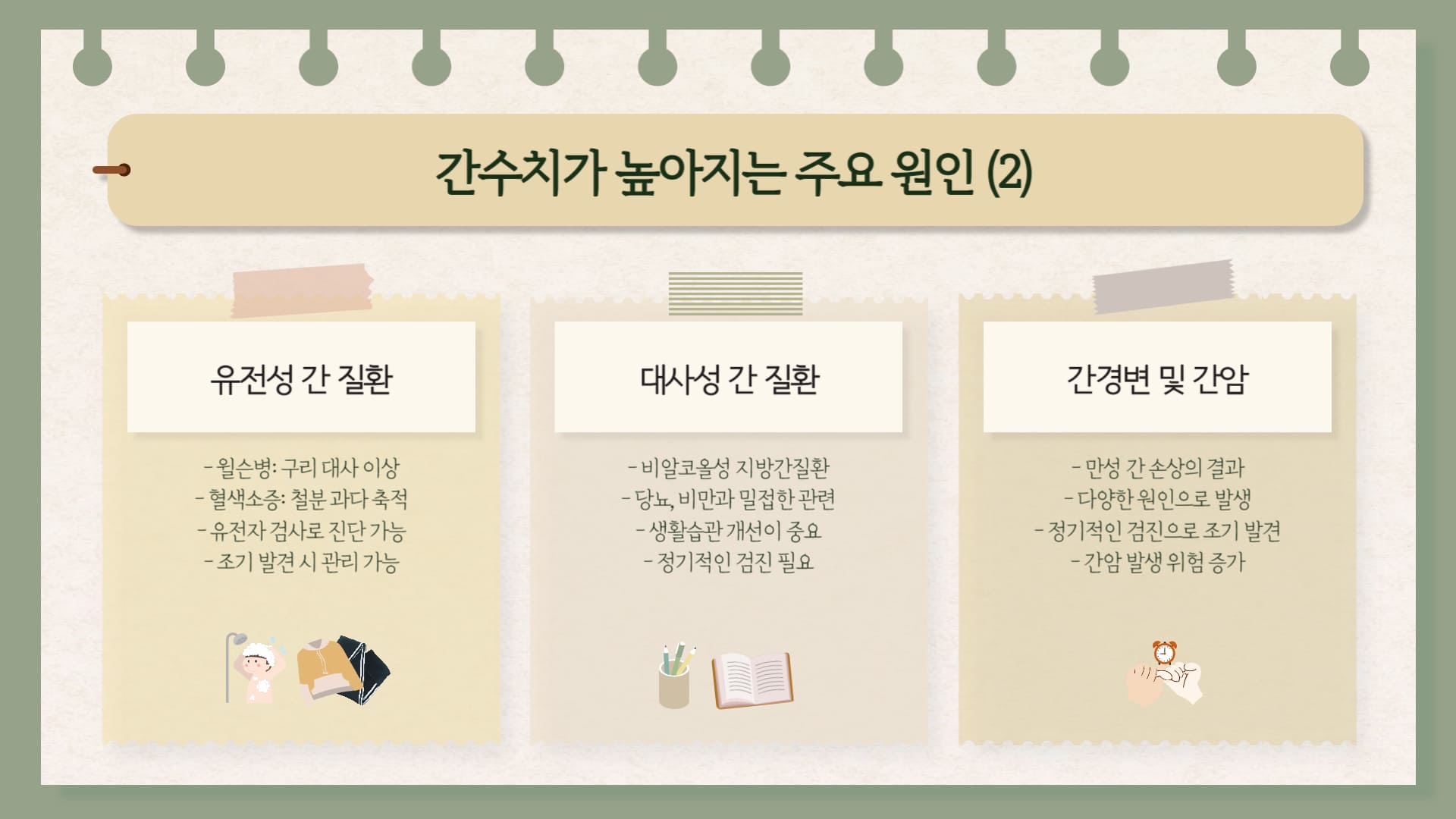 • 유전성 및 대사성 간 질환 : 윌슨병(구리 대사 이상), 혈색소증(철분 과다 축적), 알파-1 항트립신 결핍증 등이 해당됩니다.