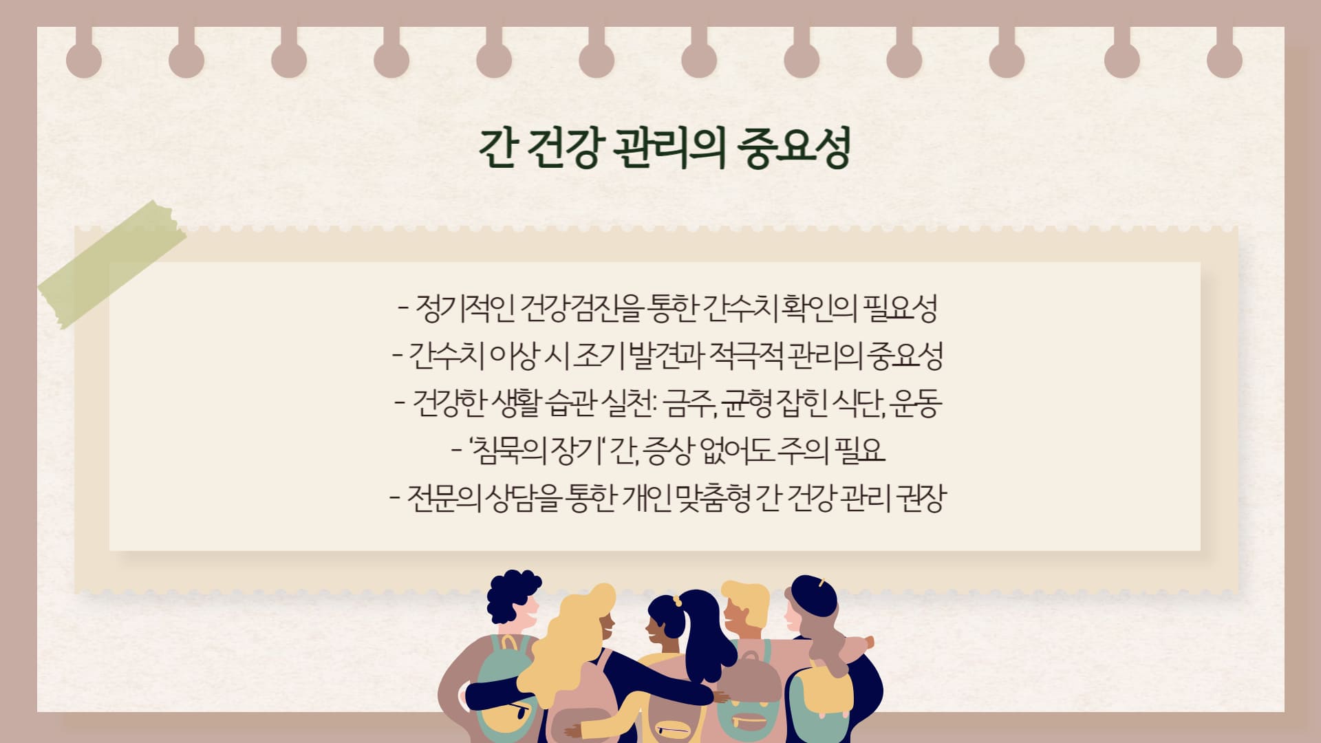 따라서 정기적인 건강검진을 통해 간수치를 확인하고, 건강한 식습관과 생활 습관 개선은 간 건강을 지키는 가장 기본적인 방법입니다.