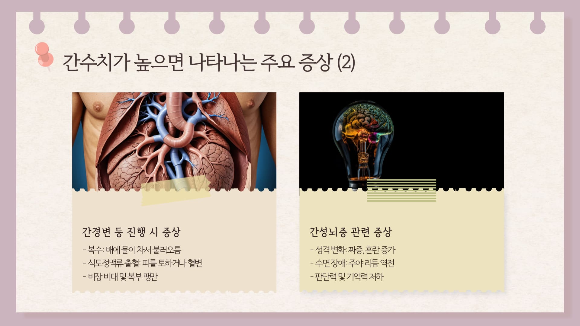 성격 변화(짜증, 혼란), 수면 장애(낮에 자고 밤에 깨어있음), 판단력 및 기억력 저하, 손 떨림, 심하면 의식 불명 및 혼수 상태. | 간 기능 저하로 인해 체내 독성 물질(주로 암모니아)이 제대로 해독되지 못하고 뇌에 영향을 미쳐 발생. 응급 상황으로 즉시 병원 방문 필요. |