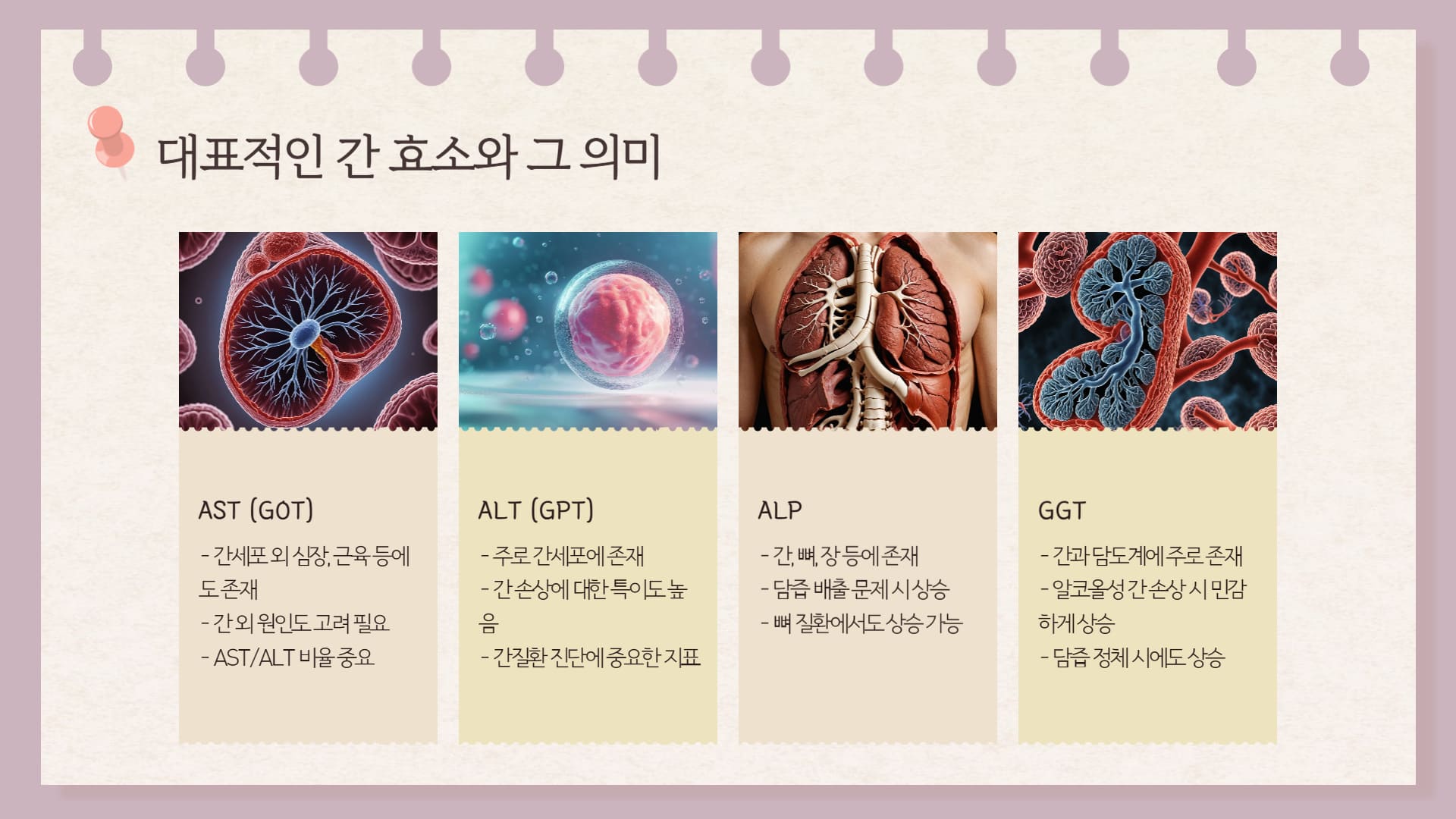 - AST (Aspartate Transaminase, GOT): 간세포 외에도 심장, 근육, 신장 등에도 존재하는 효소입니다. 따라서 AST만 상승했을 경우 간 외 다른 원인도 고려해야 합니다.