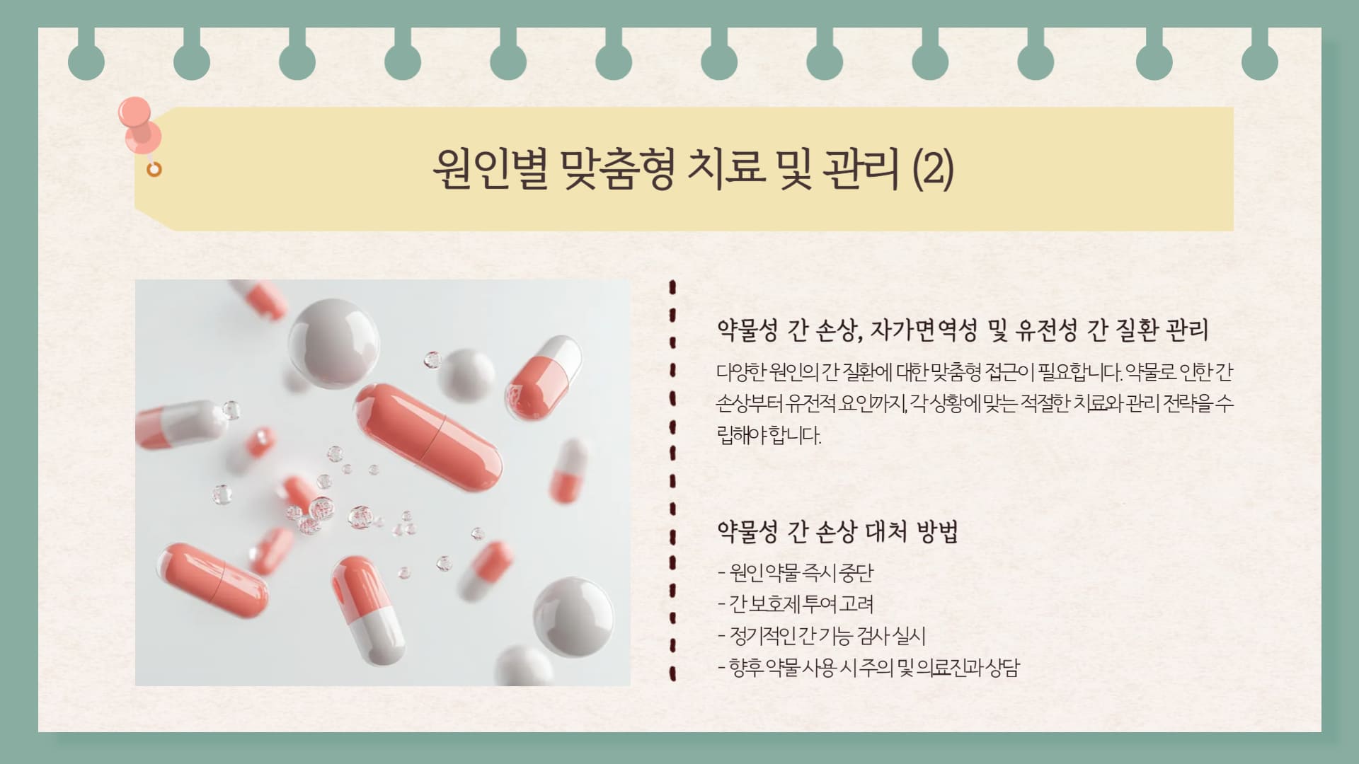- 바이러스성 간염: 원인 바이러스에 따라 항바이러스제 치료 등을 시행하며, 정기적인 검사와 관리가 매우 중요합니다.