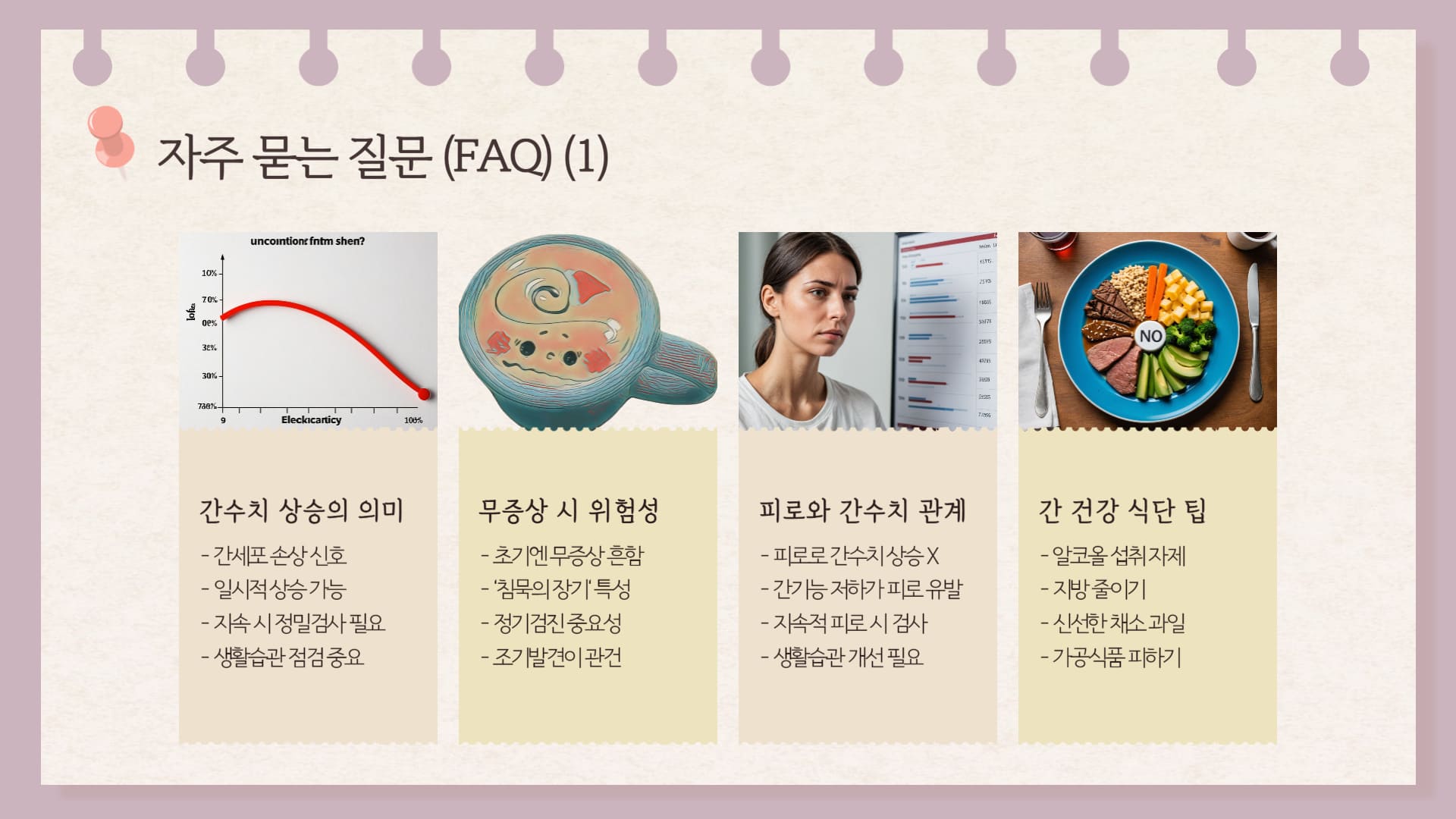 - 자가 판단 및 민간요법 의존 금물: 인터넷 정보나 주변 사람들의 말에 의존하여 스스로 진단하거나, 과학적으로 검증되지 않은 민간요법이나 건강기능식품을 임의로 복용하는 것은 매우 위험합니다. 오히려 간에 더 큰 부담을 주거나 치료 시기를 놓쳐 상태를 악화시킬 수 있습니다.
