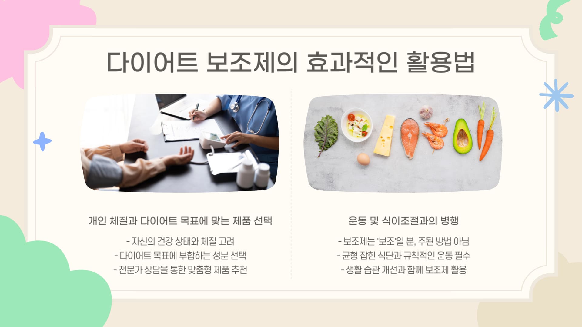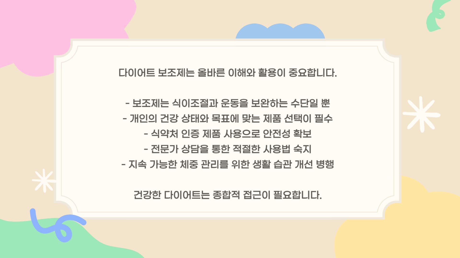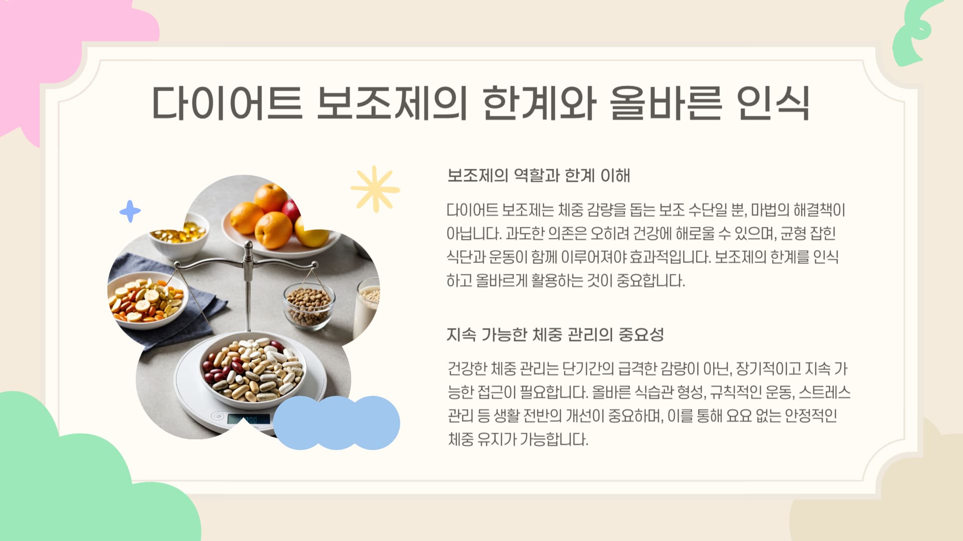 결국 다이어트 보조제는 어디까지나 보조적인 역할일 뿐, 성공적인 체중 관리의 핵심은 역시 건강한 식단에 있습니다.