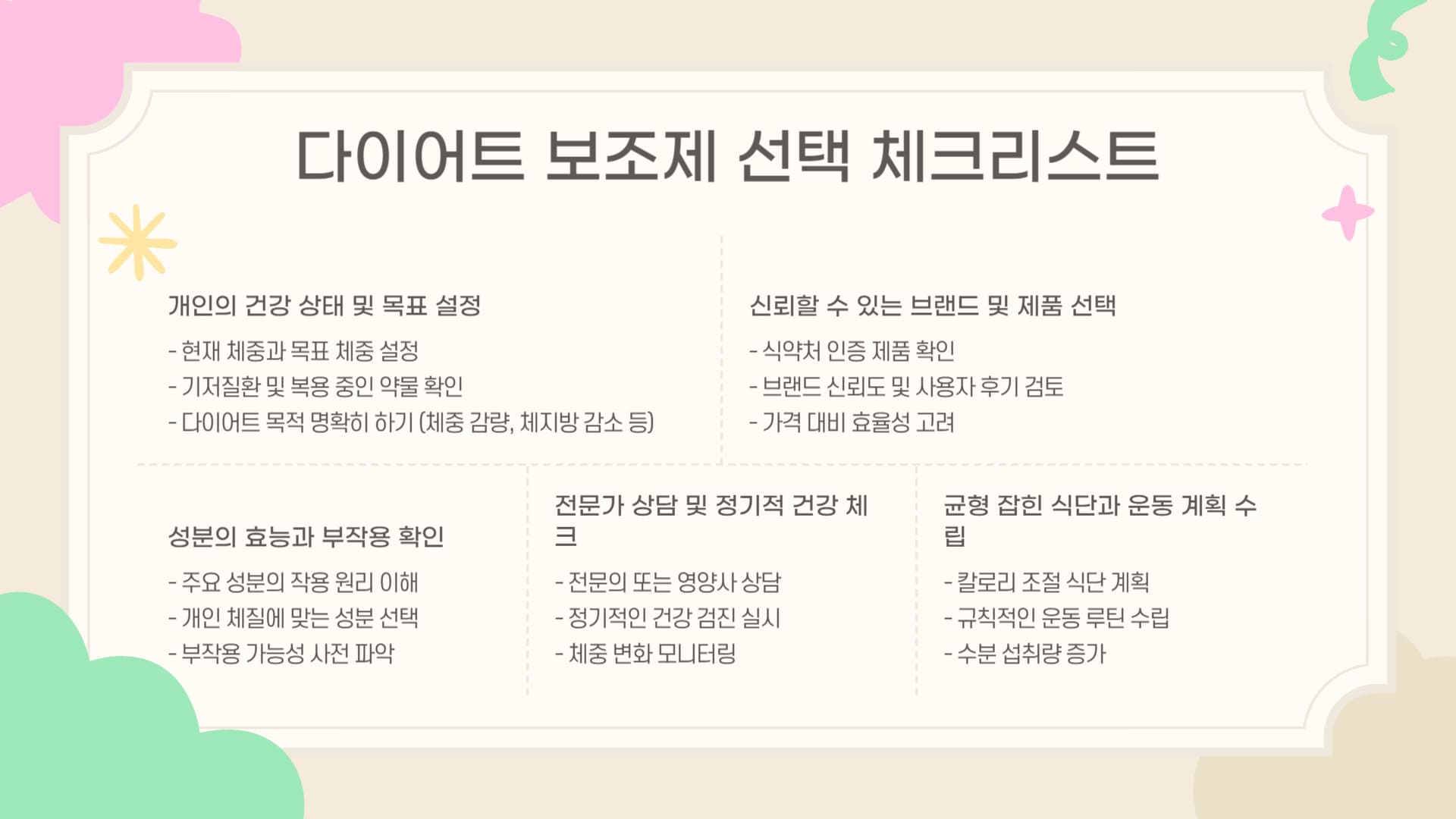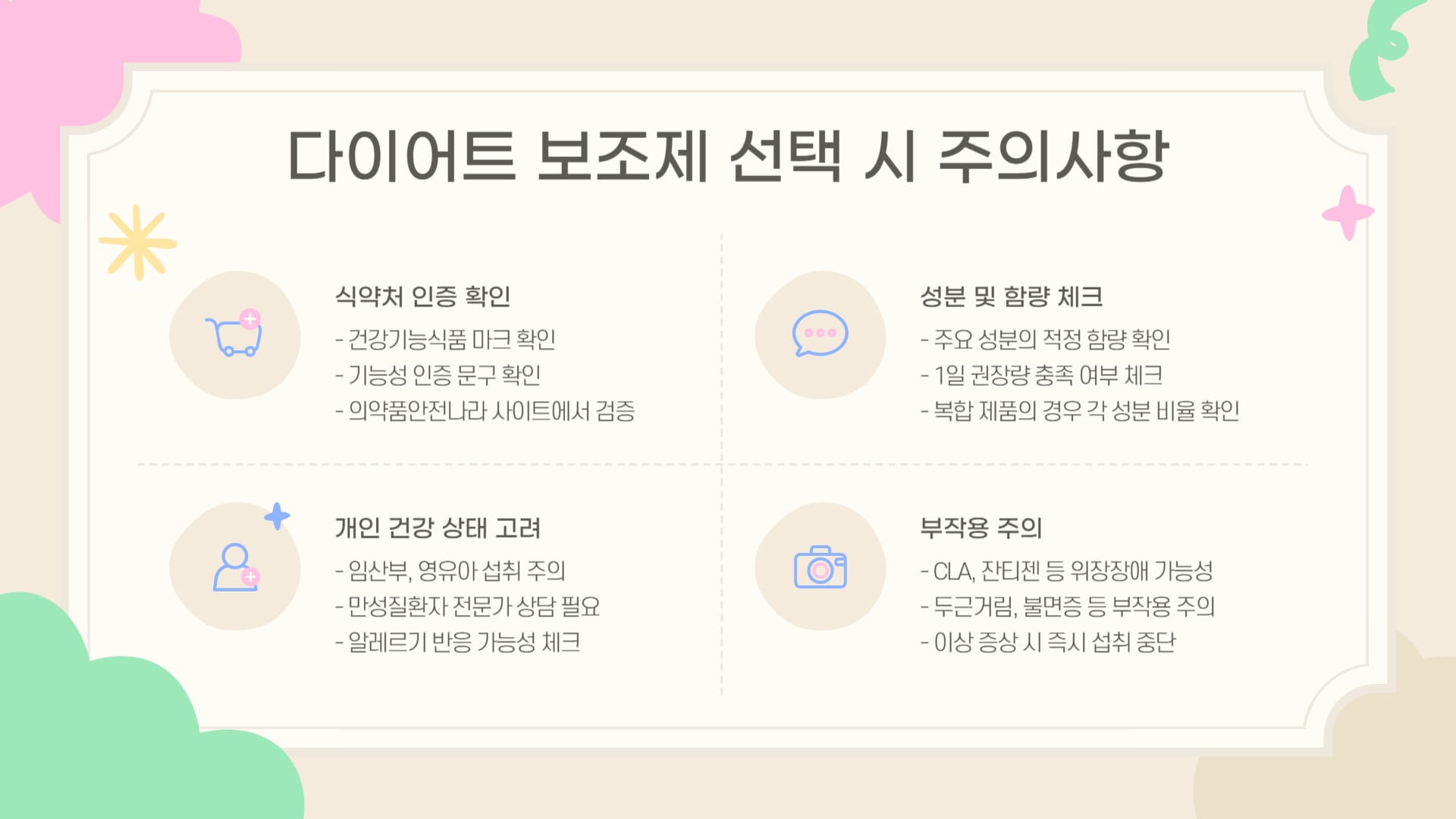 다이어트 보조제를 선택할 때는 식약처 인증 제품인지 확인하고, 함량이 적절한지 살펴보며, 자신의 건강 상태에 맞는 제품을 선택하는 것이 중요합니다. 또한 부작용 가능성을 미리 파악하고, 정품 구매를 통해 안전하게 섭취하는 것이 좋습니다.