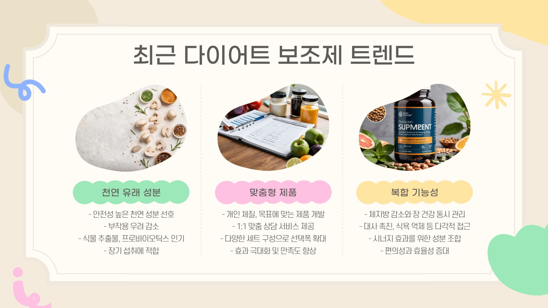 - 최근 트렌드는 천연 유래 성분, 맞춤형 다이어트, 장 건강과 체지방 감소를 동시에 관리할 수 있는 복합 기능성 제품이 인기를 끌고 있습니다