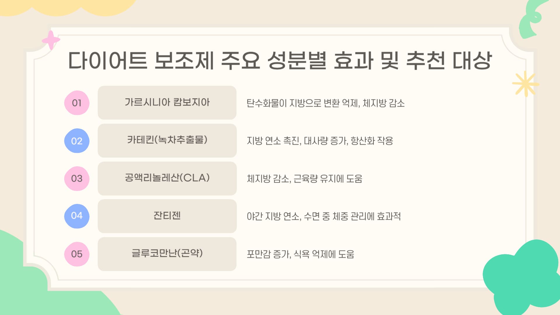 1. 다이어트 보조제 주요 성분별 효과 및 추천 대상