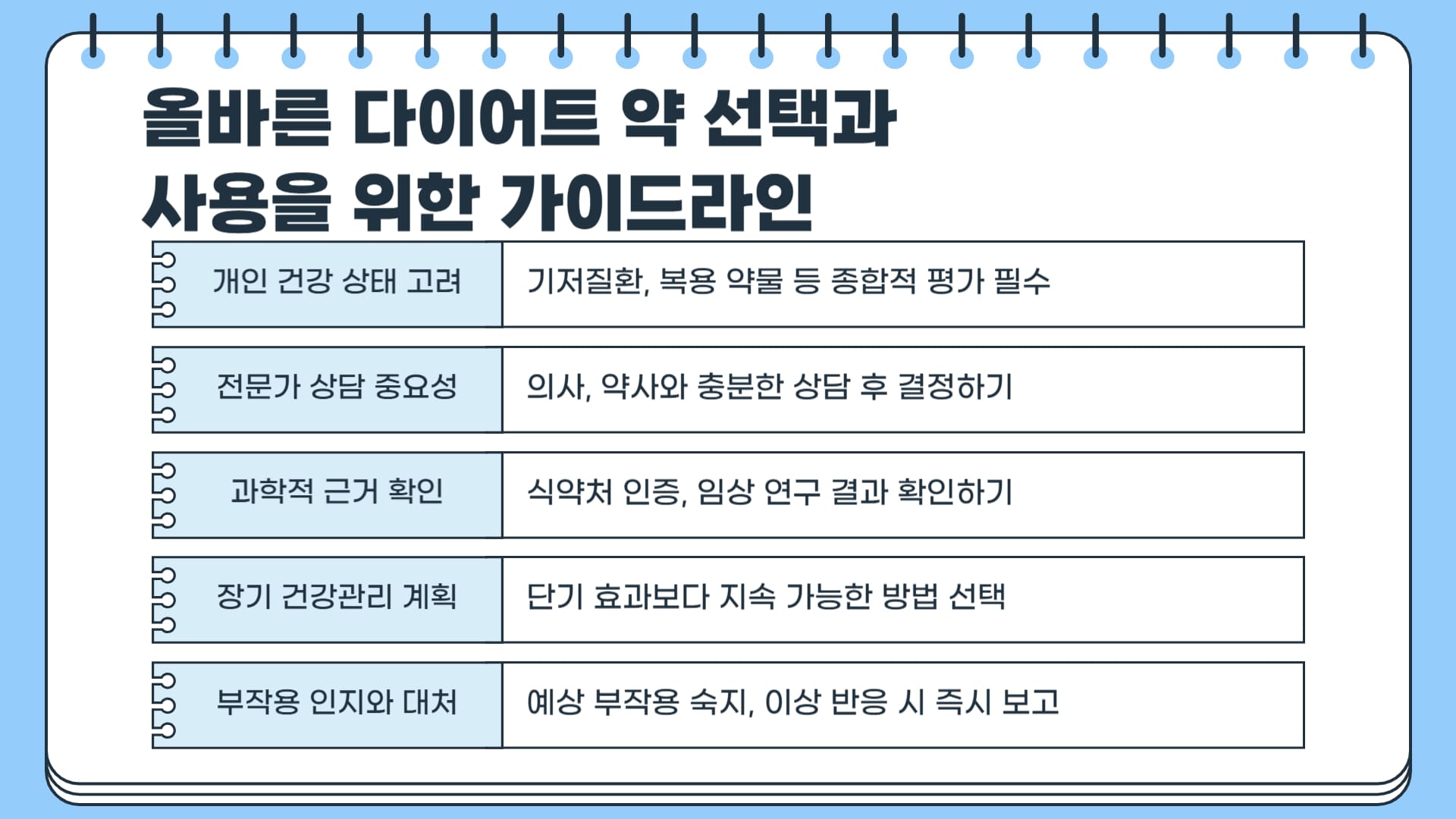 결론적으로, 처방 없이 구매 가능한 다이어트 약 종류(일반의약품/건강기능식품)는 효과에 대한 기대를 낮추고, 안전성을 꼼꼼히 확인하며, 건강한 생활 습관의 보조 역할로서만 신중하게 고려해야 합니다.