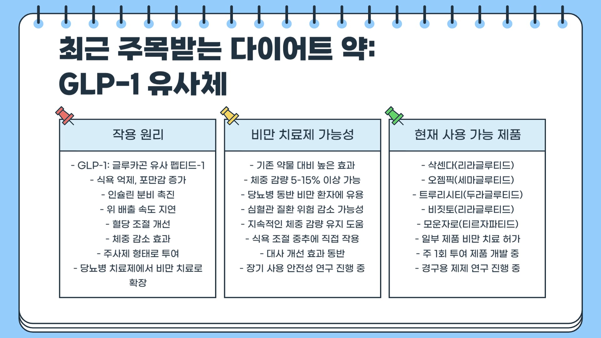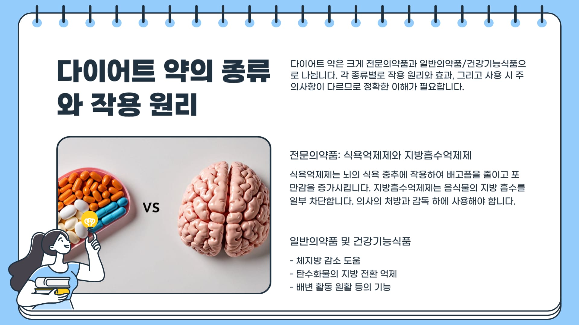 주요 다이어트 약 종류별 특징과 기대 효과를 간단히 정리했습니다.