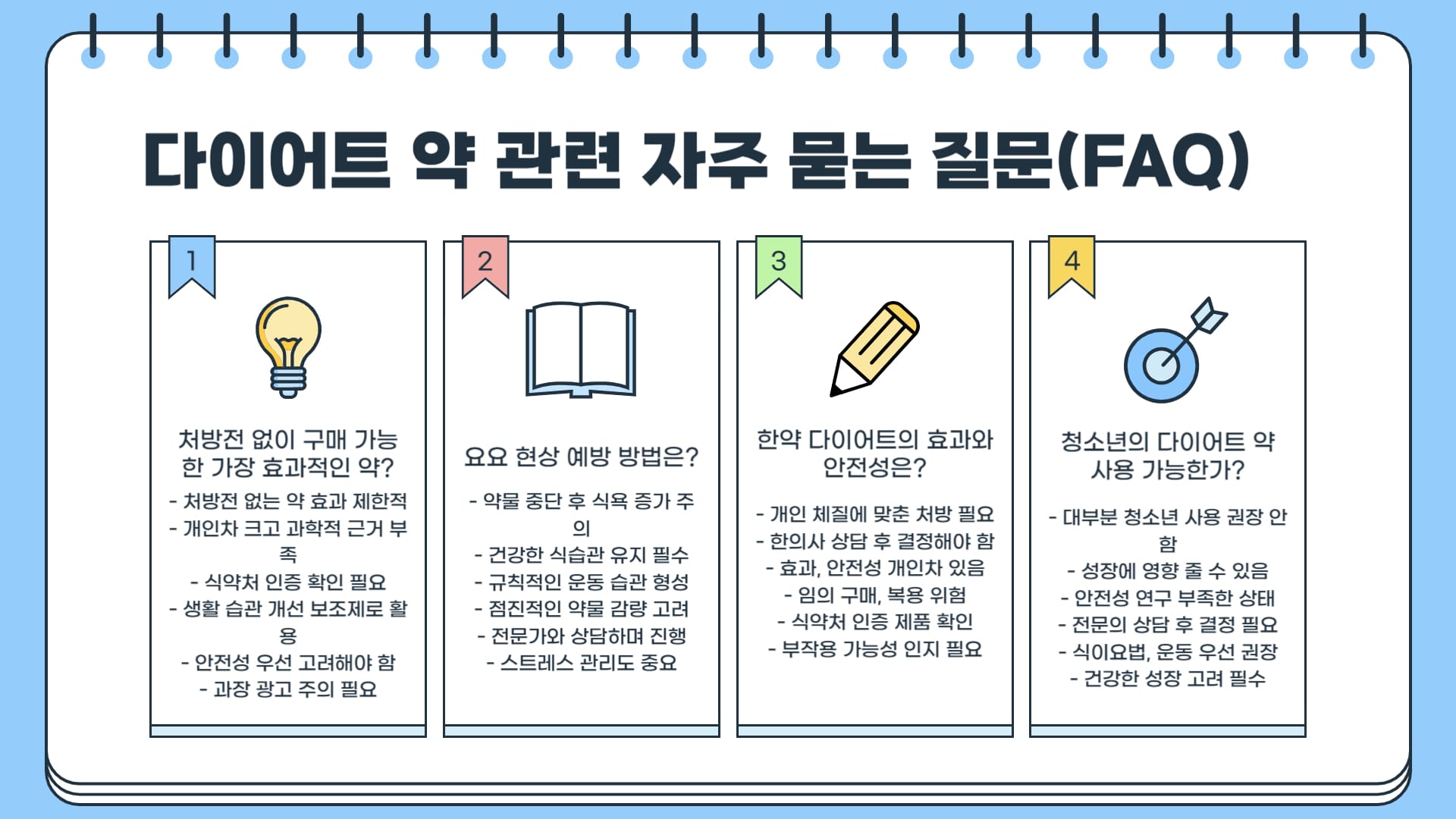 A5: 대부분의 다이어트 약(전문의약품 및 건강기능식품)은 성장기 청소년에게는 권장되지 않으며, 안전성 연구도 부족합니다. 청소년 비만은 반드시 소아청소년과 의사 또는 전문가와 상담하여 식단, 운동 등 건강한 방법으로 관리해야 합니다.