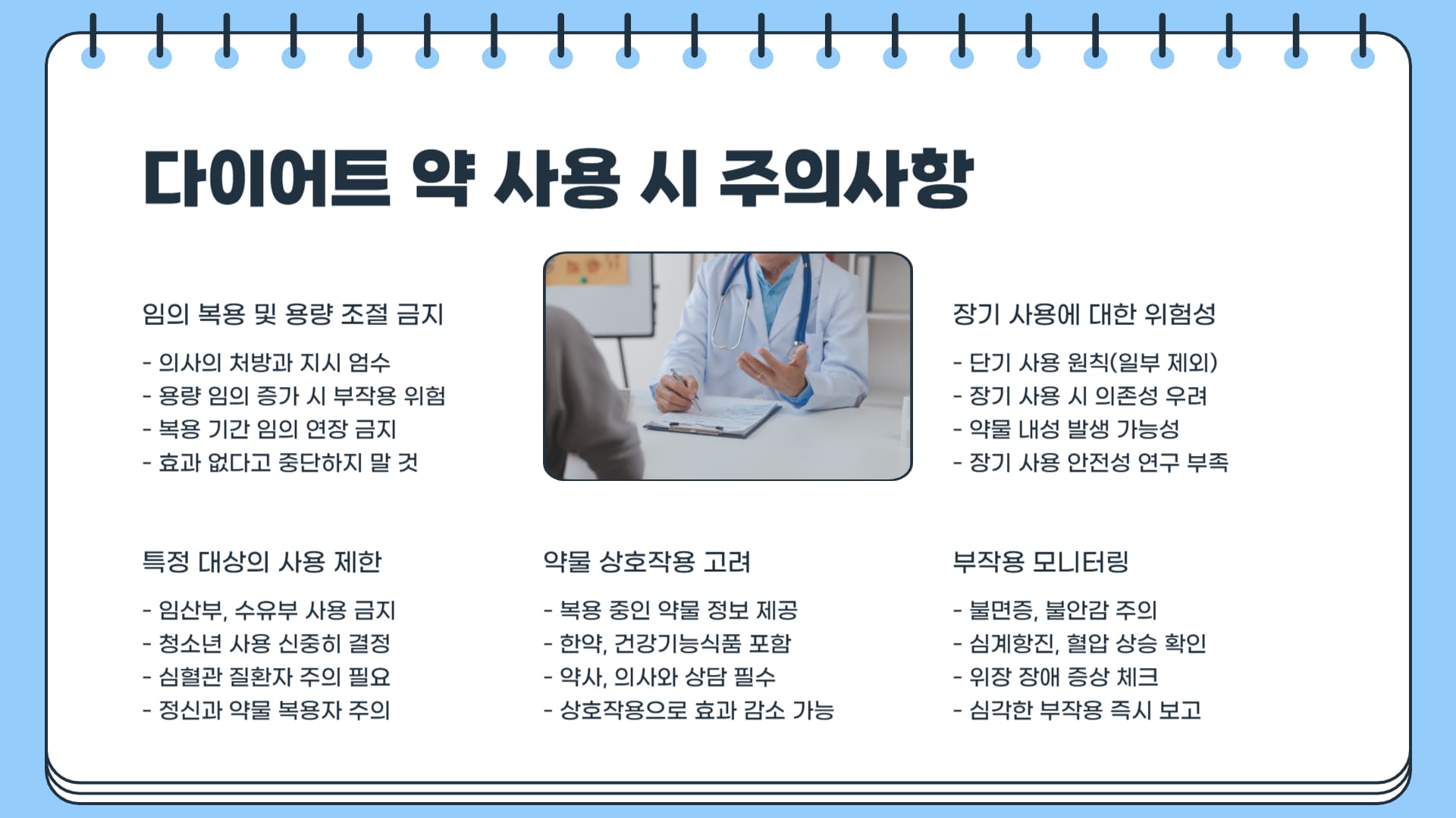 - 의사와의 상담: 처방약 복용 중에는 반드시 정기적으로 병원을 방문하여 체중 변화, 부작용 발생 여부, 건강 상태 등을 점검하고 의사와 상담해야 합니다. 특히 식욕억제제 등은 단기 사용이 원칙인 경우가 많으므로, 의사의 지시 없이 임의로 복용 기간을 늘리거나 용량을 변경해서는 안 됩니다.
