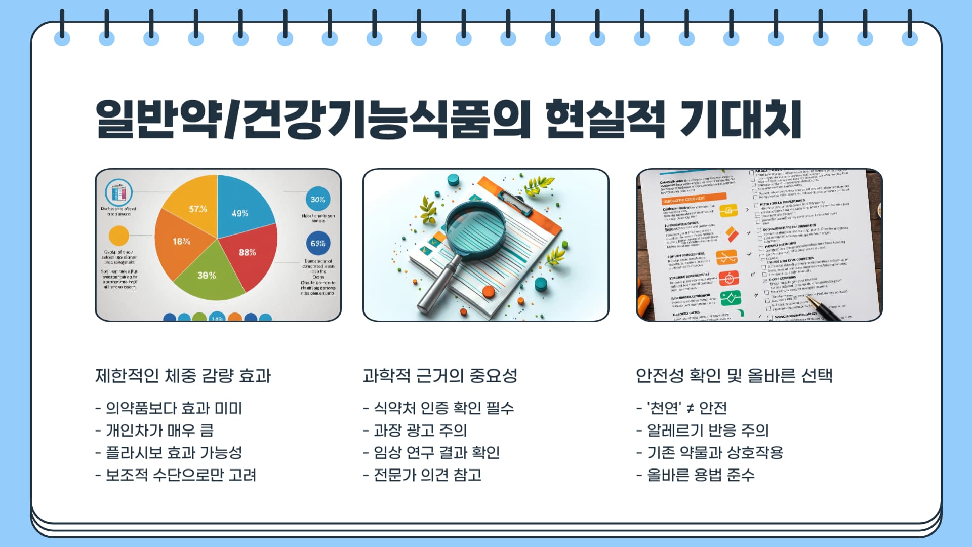 질병 치료 목적 아님. 체중 감량 효과는 매우 제한적이거나 개인차가 큼. 과학적 근거 부족한 경우 많음. 건강한 식단/운동의 보조적 역할로만 고려. |