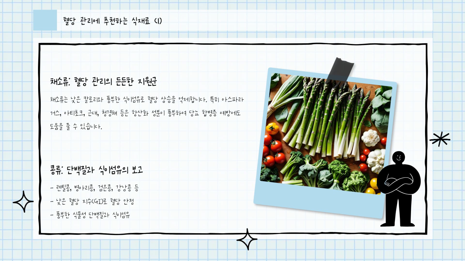 이제 혈당 관리에 어떤 식재료가 좋은지 알았으니, 이것들을 활용해서 실제 식단을 구성해 볼 차례겠죠?