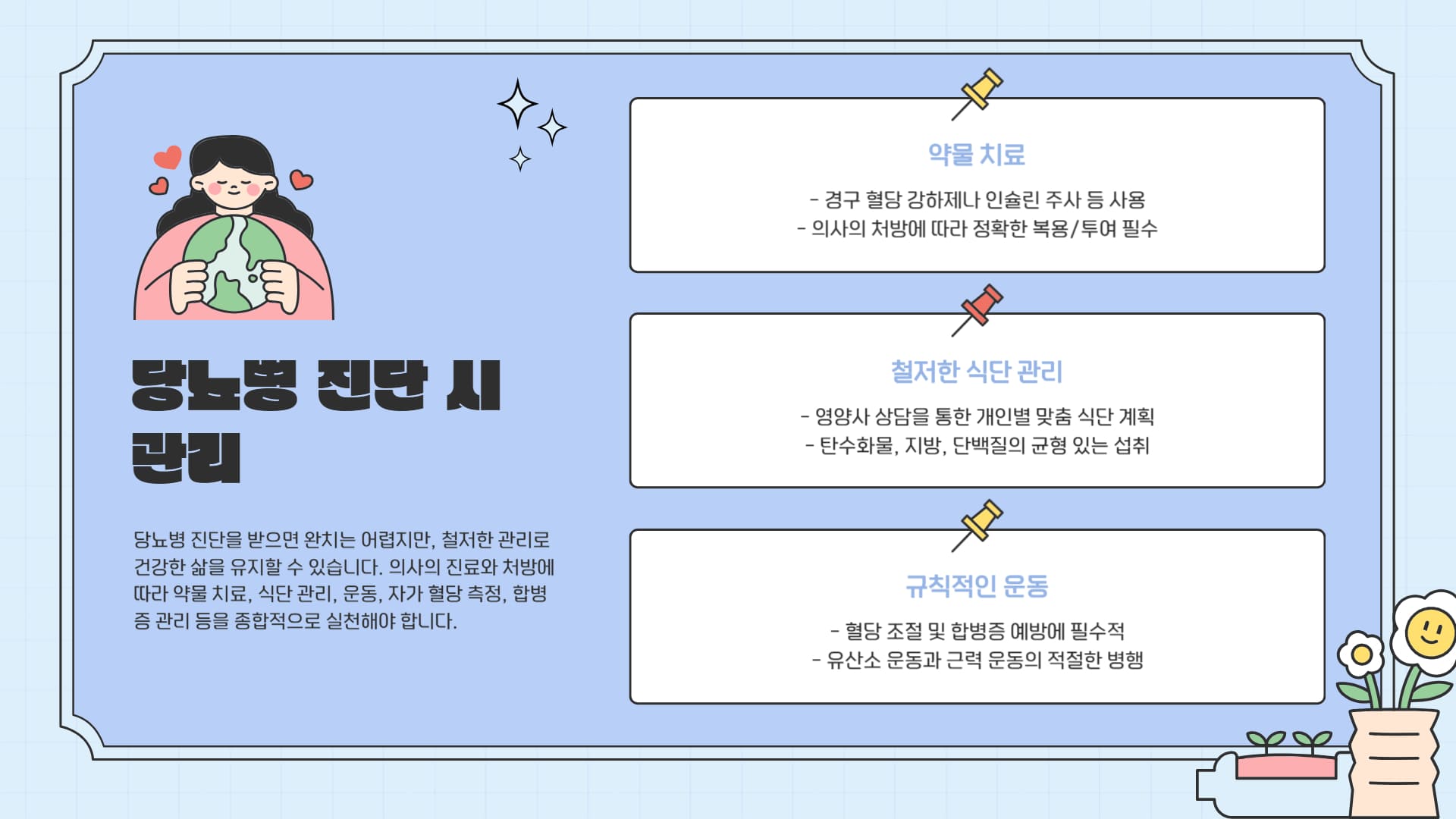 • 당뇨병 진단 시: 당뇨병은 완치가 어려운 만성 질환이지만, 철저한 관리를 통해 건강하게 살아갈 수 있습니다. 의사의 진료 및 처방에 따라 다음과 같은 관리가 필요합니다.