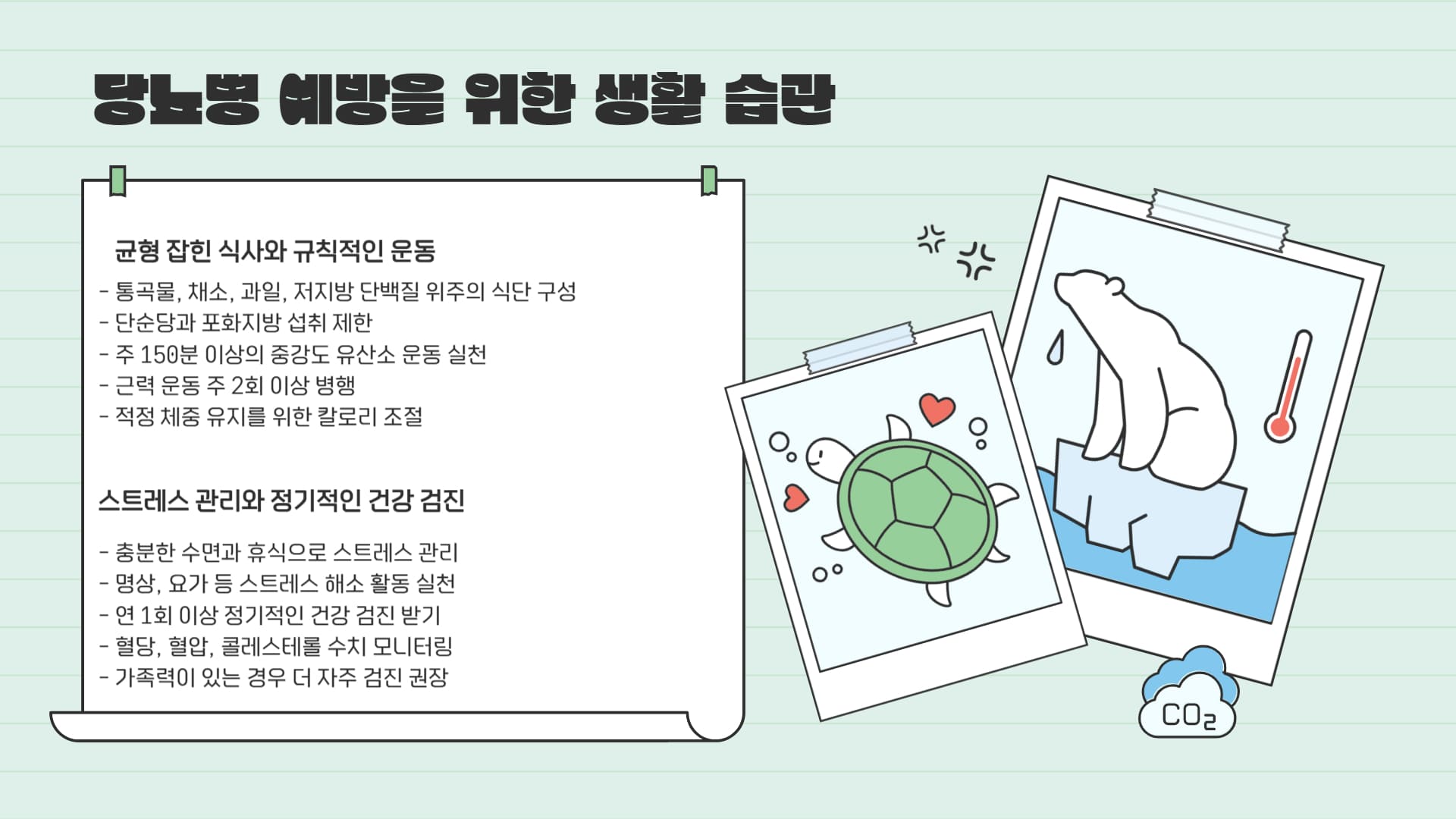 • 규칙적인 운동: 혈당 조절 및 합병증 예방에 필수적입니다.
