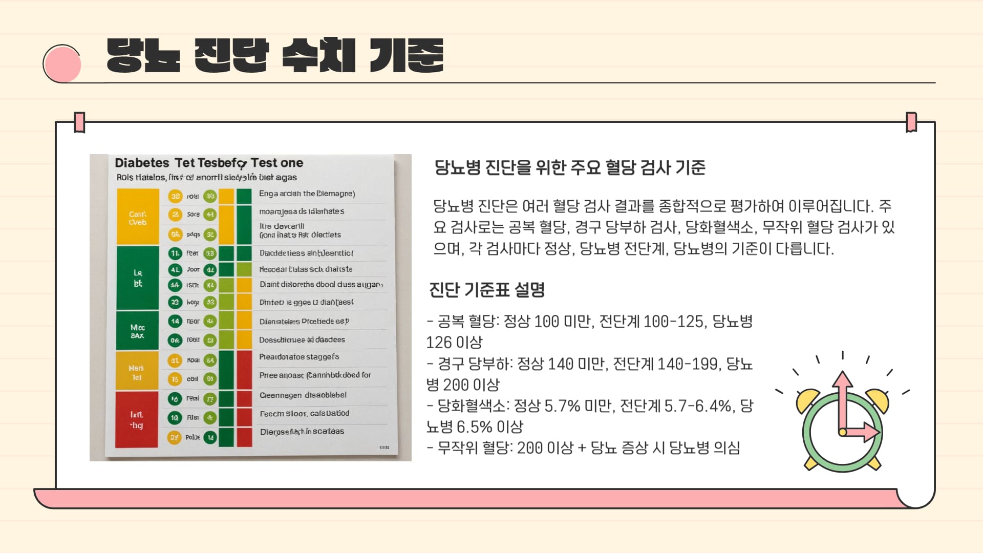 당뇨 수치 기준을 알아보니, 공복 혈당, 식후 혈당, 당화혈색소 등 다양한 검사를 통해 정상, 전단계, 당뇨병 상태를 판단한다는 것을 알 수 있습니다.