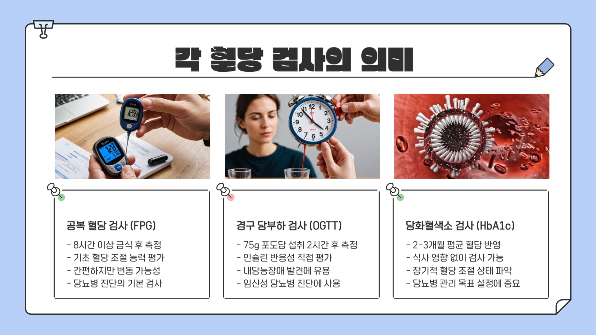 다양한 혈당 검사들은 각각 다른 측면에서 우리 몸의 혈당 조절 능력을 보여줍니다. 왜 여러 검사를 참고하여 당뇨 수치 기준을 판단할까요? 각 검사의 의미를 이해하면 내 건강 상태를 파악하는 데 도움이 됩니다.