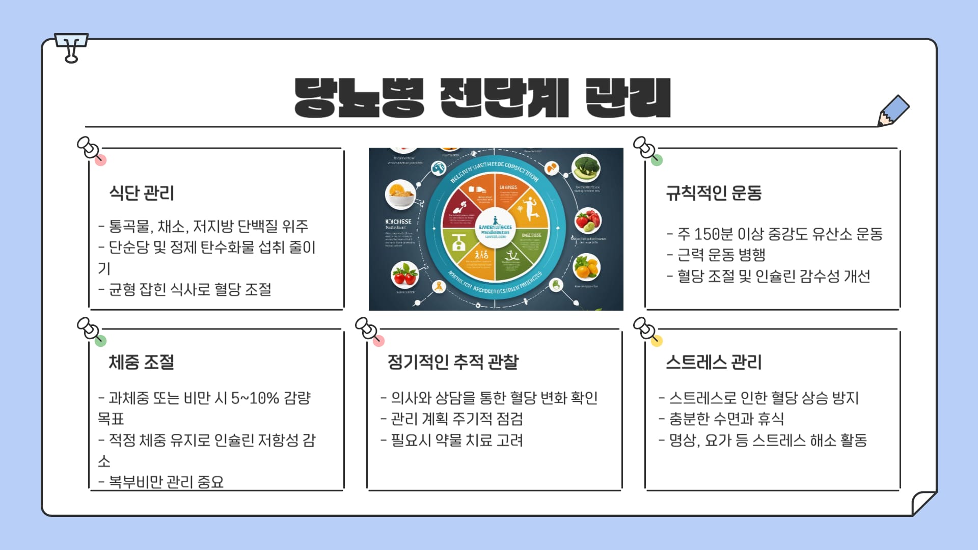 - 규칙적인 운동: 혈당 조절 및 합병증 예방에 필수적입니다.