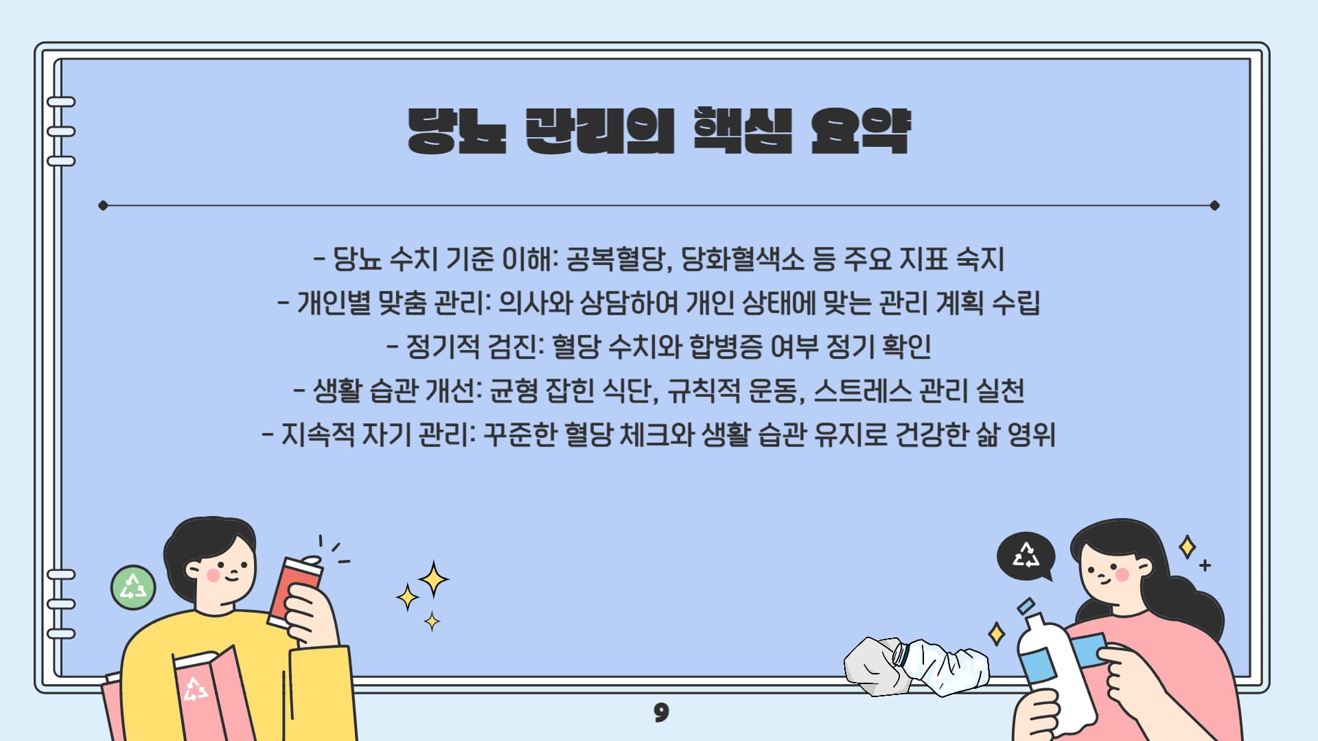 - 약물 치료: 필요시 경구 혈당 강하제나 인슐린 주사 등 약물 치료를 시작합니다.