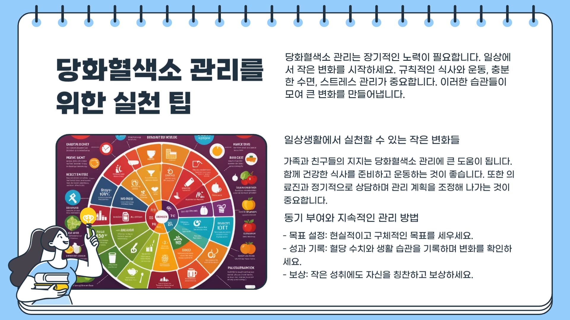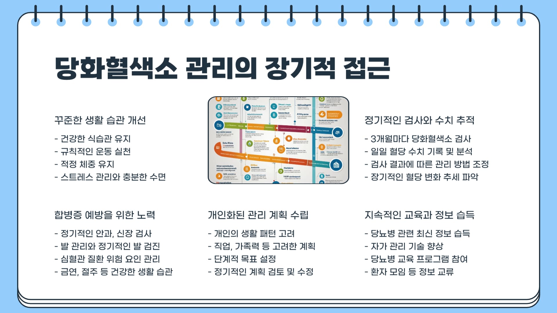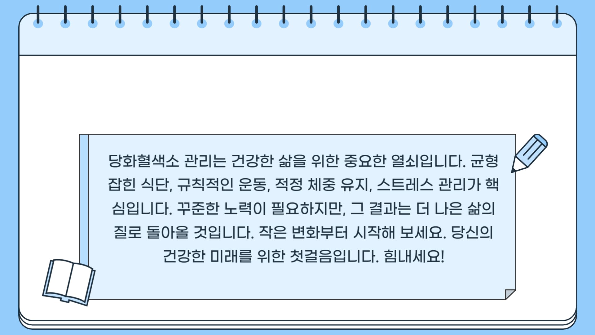 당화혈색소 수치는 단기간에 변하지 않으므로, 조급해하지 않고 장기적인 관점에서 건강한 습관을 만들어나가는 것이 중요합니다.