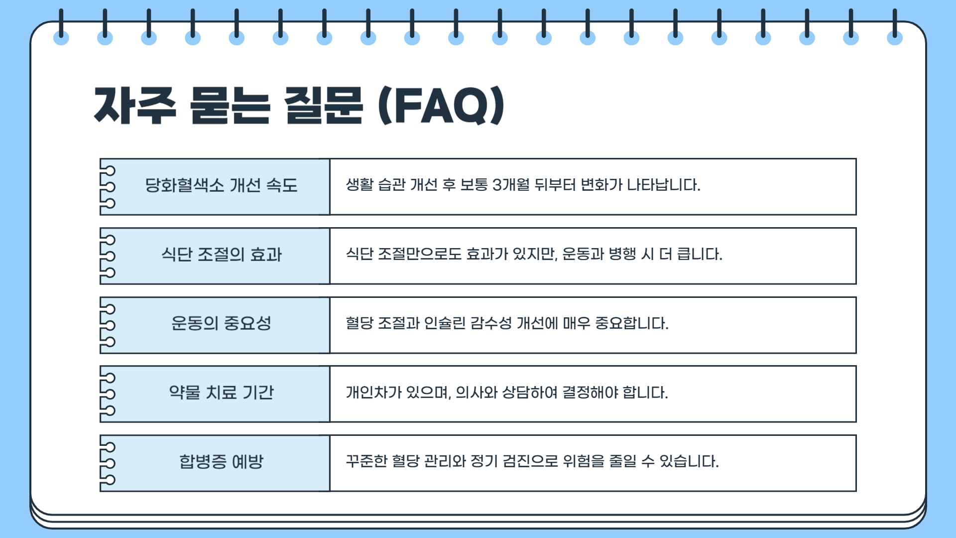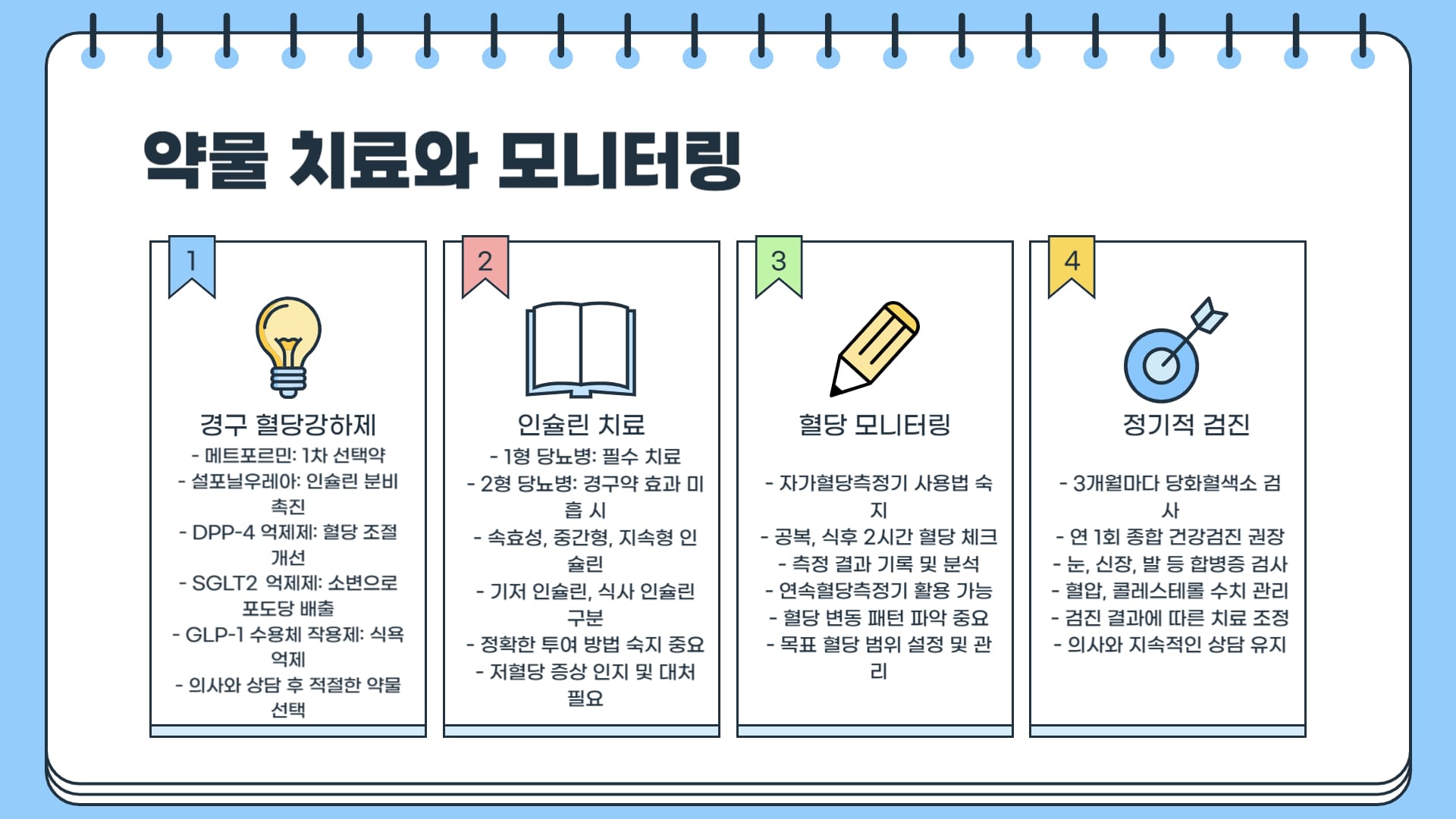 | 꾸준한 모니터링 | 정기적인 병원 방문(혈당 및 당화혈색소 검사), 필요시 자가 혈당 측정 | 현재 혈당 조절 상태를 파악하고 관리 계획의 효과를 평가하며, 필요한 경우 계획을 조정하기 위한 필수 과정입니다. |
