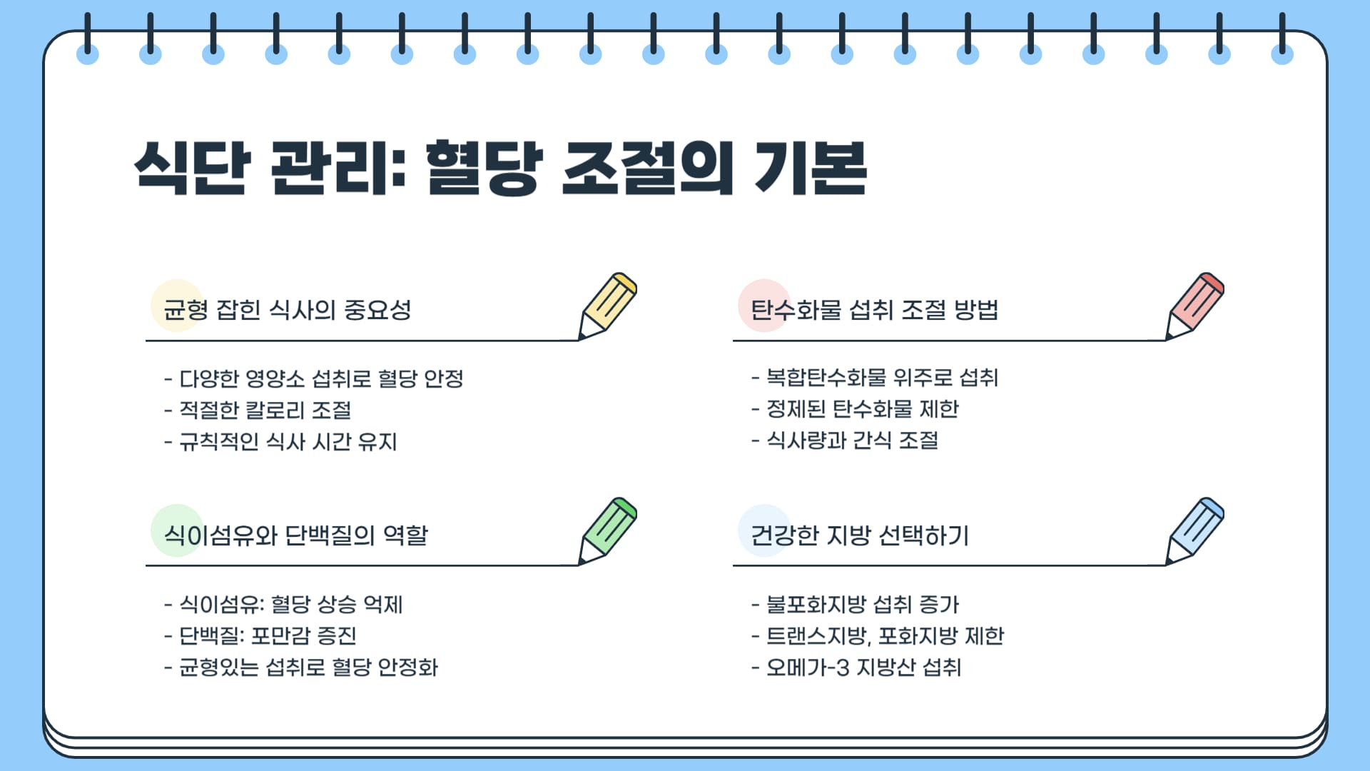 | 식단 관리 | 균형 잡힌 식사, 정제 탄수화물/단순당 제한, 식이섬유 충분히 섭취, 건강한 지방 선택, 규칙적인 식사 시간 지키기, 저염식 실천 | 식후 혈당 급상승 방지, 인슐린 민감성 개선, 체중 조절 등에 직접적인 영향을 미쳐 혈당 조절의 기본이 됩니다. |