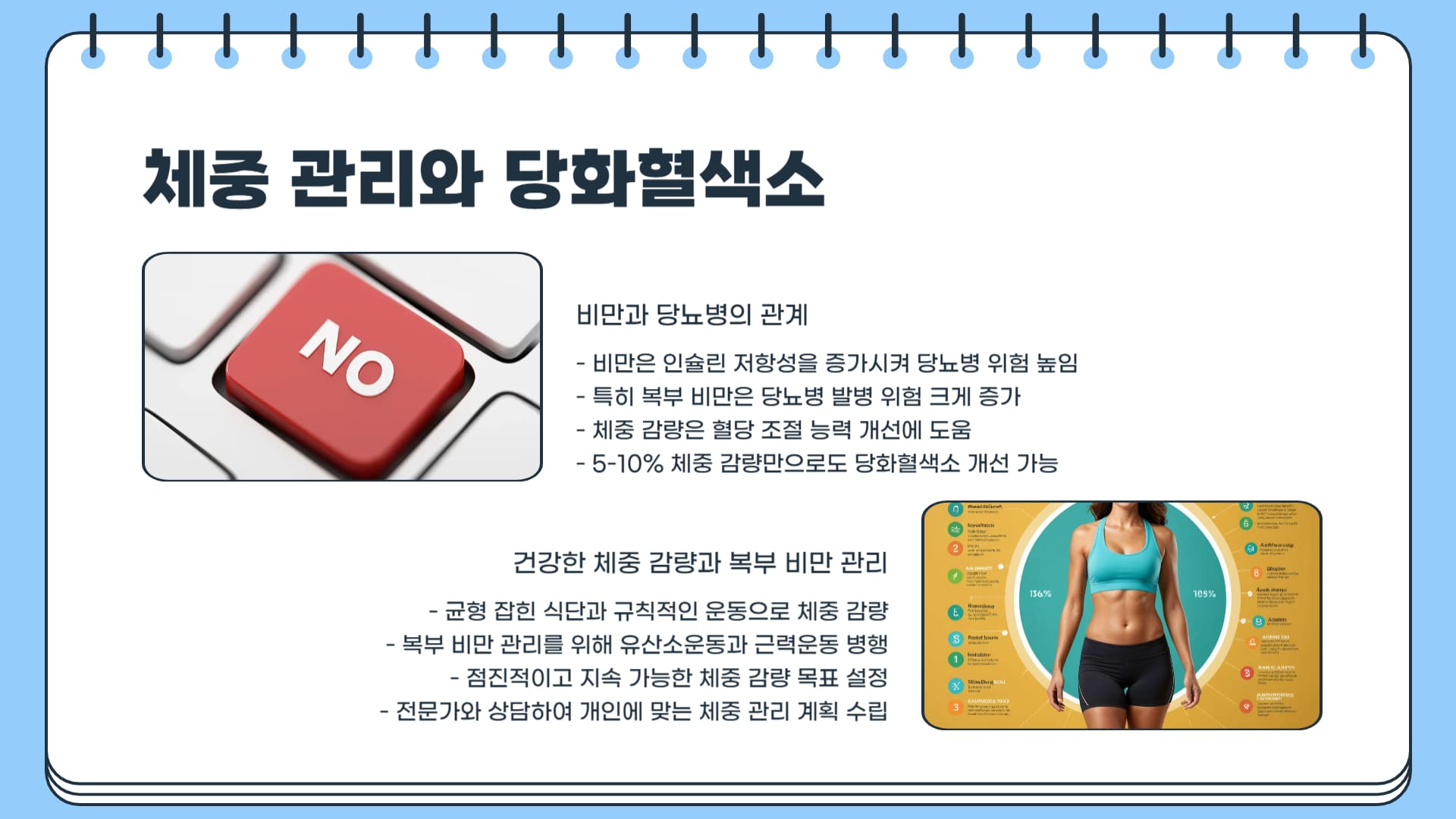 | 적정 체중 유지 | 건강한 식단과 규칙적인 운동을 통한 체중 감량 및 유지 (특히 복부 비만 관리 중요) | 체중 감량, 특히 내장 지방 감소는 인슐린 저항성을 개선하여 혈당 조절에 매우 효과적입니다. |