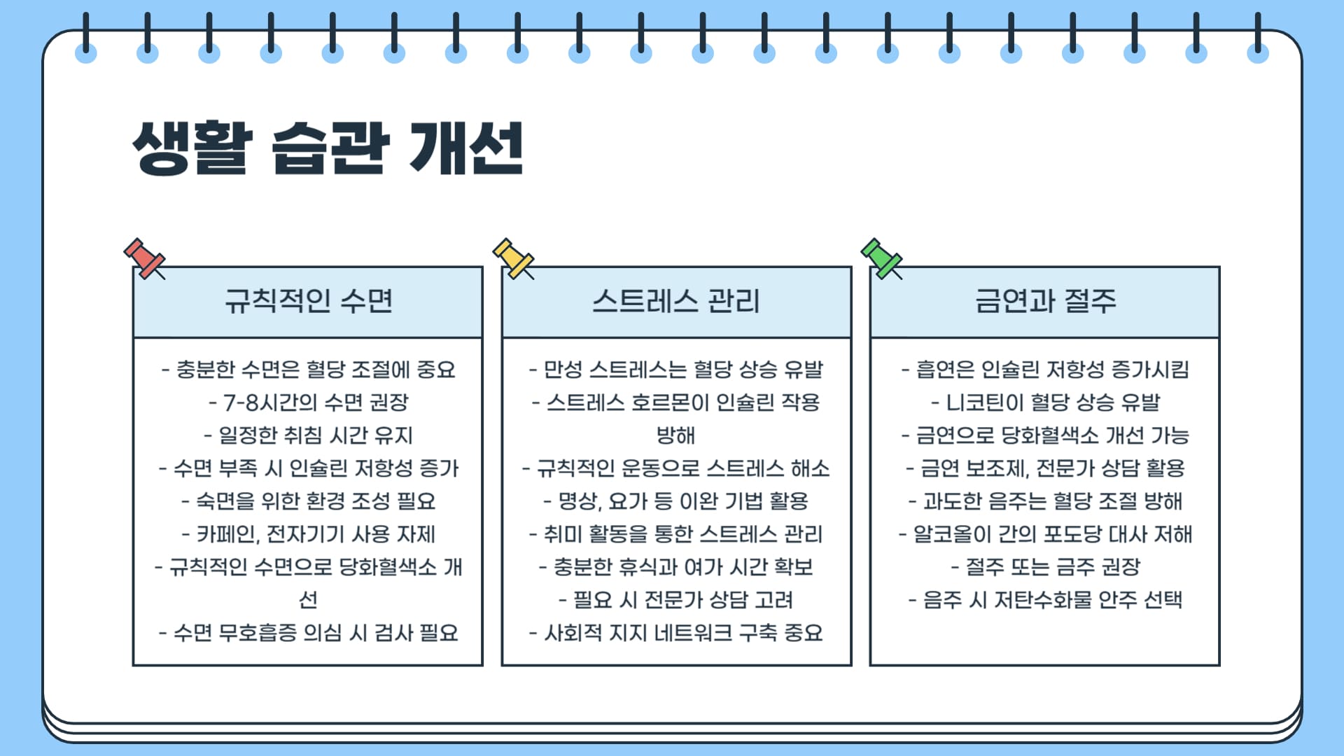 - 금연과 절주: 흡연은 인슐린 저항성을 높이고 혈관 건강을 악화시키며, 과음은 혈당 조절을 불안정하게 만들 수 있습니다. 금연과 절주는 필수입니다.