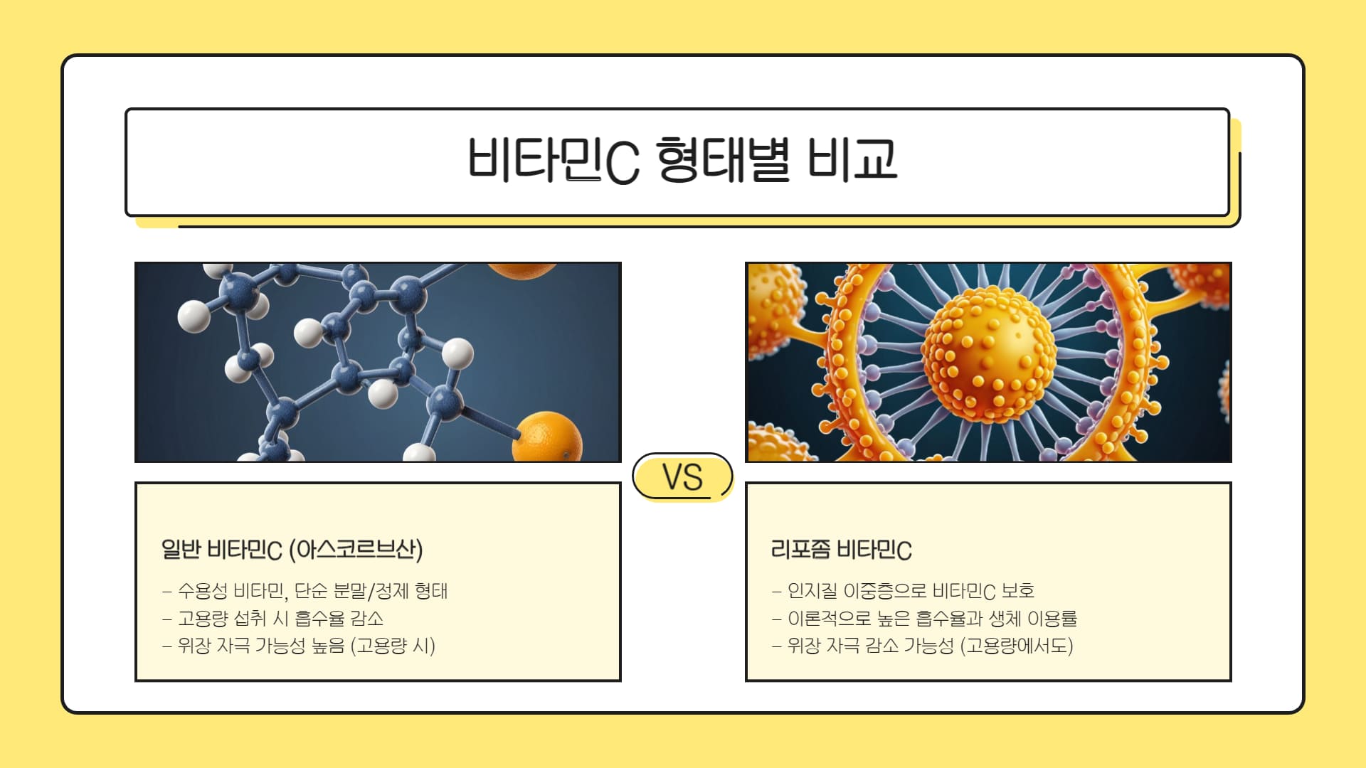 | 구조 | 비타민c를 인지질 이중층(리포좀)으로 감싼 형태 | 비타민c(아스코르브산) 분말 또는 정제 형태 |