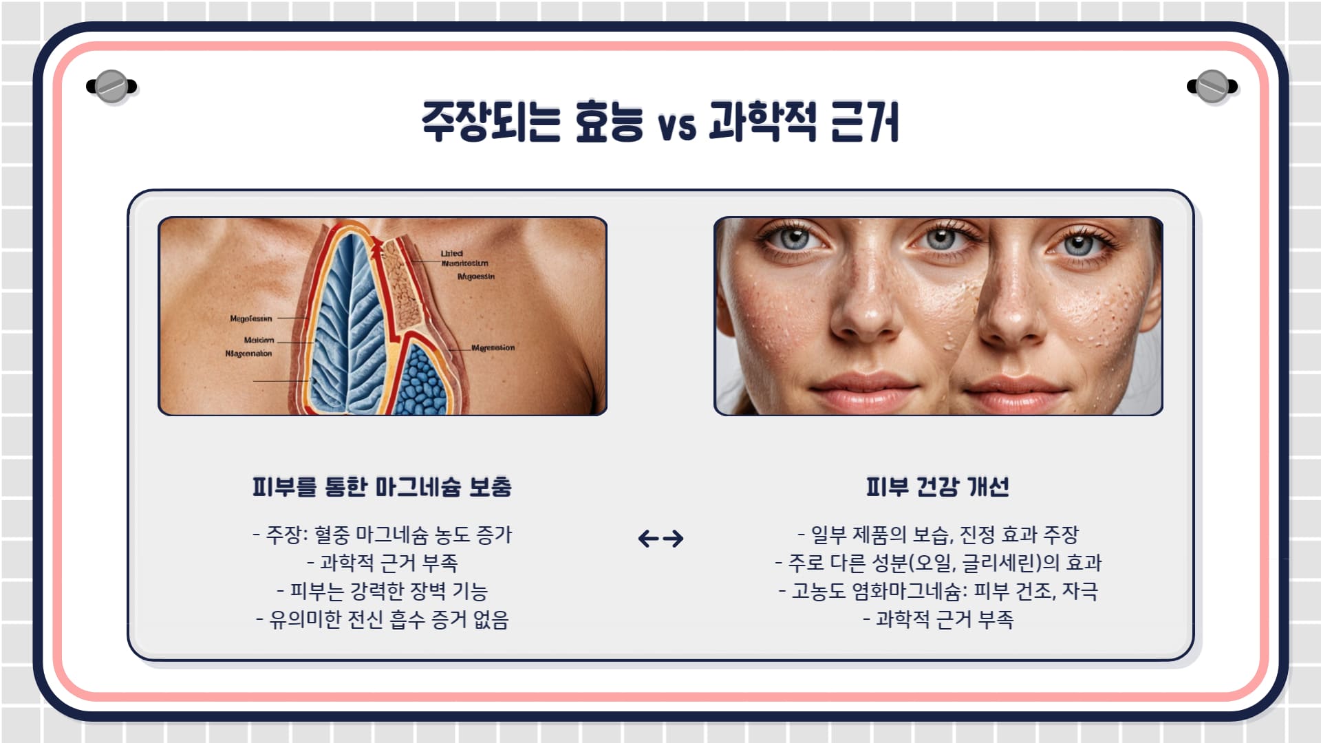 특히 피부를 통해 마그네슘을 효과적으로 '보충'할 수 있다는 주장은 현재까지의 연구 결과로는 뒷받침되기 어렵습니다. 신뢰할 수 있는 건강 정보원을 통해 객관적인 사실을 확인하는 것이 중요합니다.
