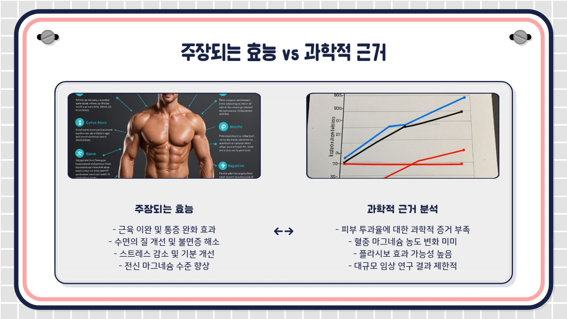 • 효과에 대한 현실적인 기대: 전신 마그네슘 보충이나 특정 질병 치료 효과를 기대해서는 안 됩니다. 국소적인 근육 이완감이나 플라시보 효과 정도를 기대하는 것이 현실적입니다.