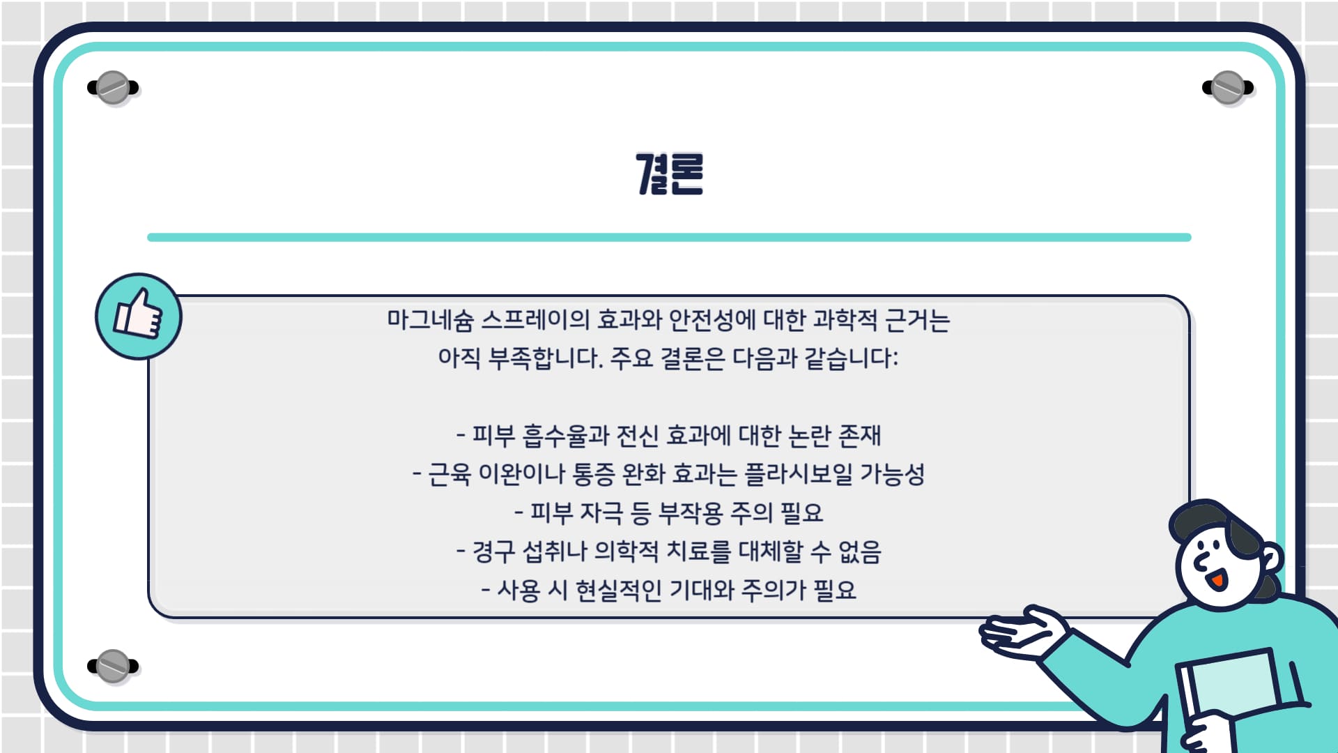 결론적으로, 마그네슘 스프레이효능에 대한 주장들은 대부분 과학적 근거가 부족하거나 일화적인 경험에 기반한 경우가 많습니다.