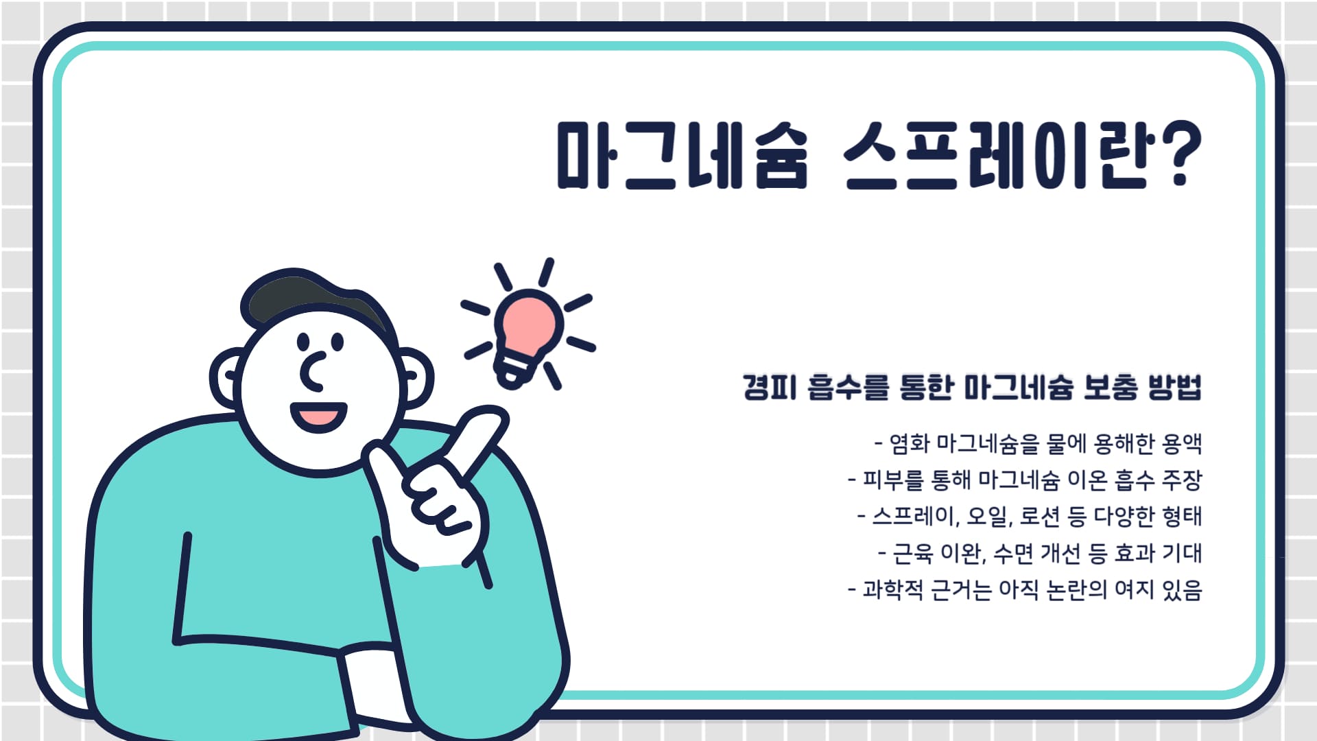 마그네슘 스프레이의 효능, 원리, 사용법 및 주의사항을 알아보았습니다. 피부에 뿌려 마그네슘을 보충한다는 개념은 편리하게 들리지만, 실제 피부 흡수율과 전신 효과에 대한 과학적 근거는 아직 부족하며 논란이 많습니다.