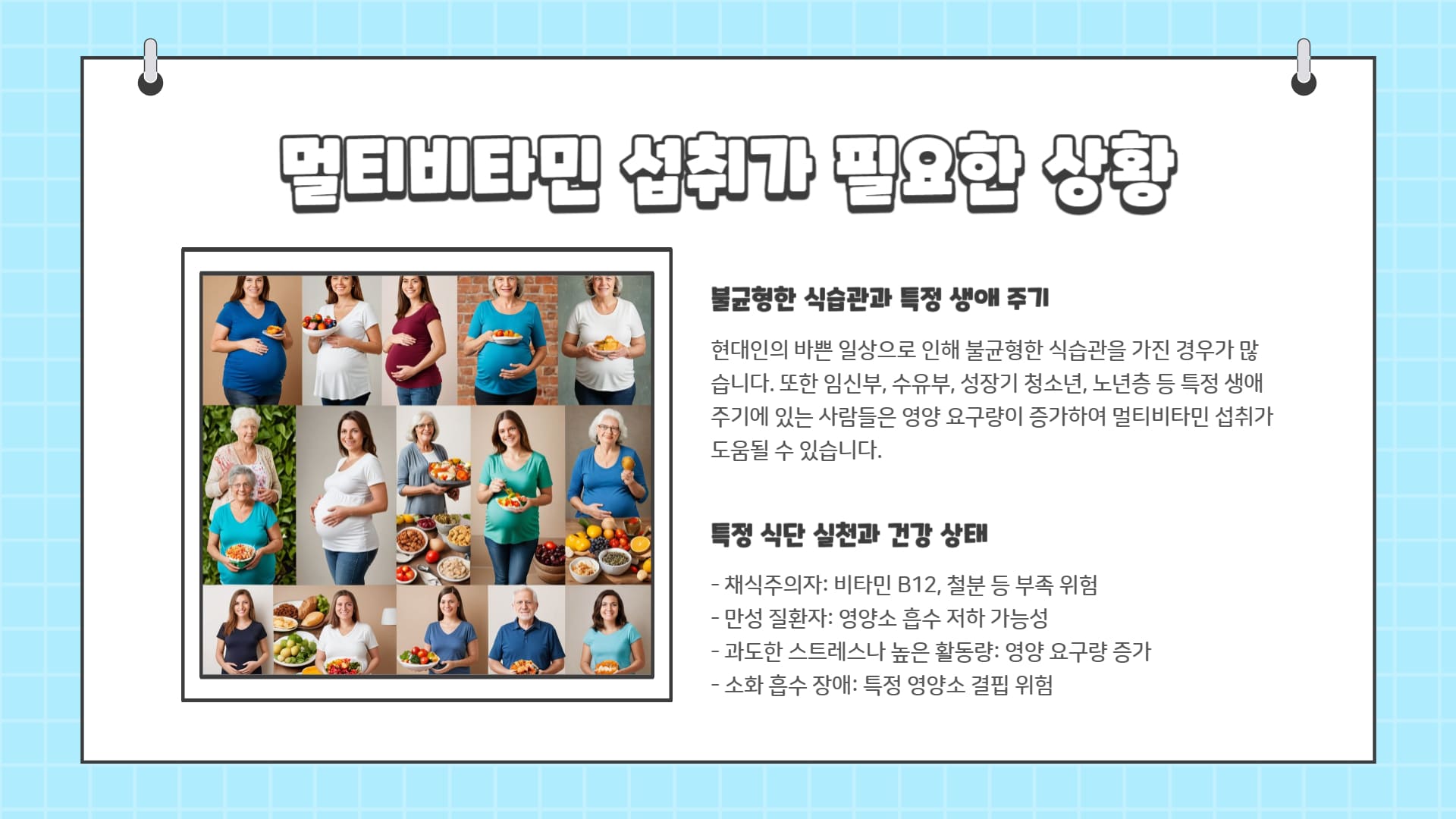 • 특정 생애 주기: 영양 요구량이 증가하는 임신부, 수유부, 성장기 청소년, 또는 영양소 흡수율이 떨어질 수 있는 노년층.