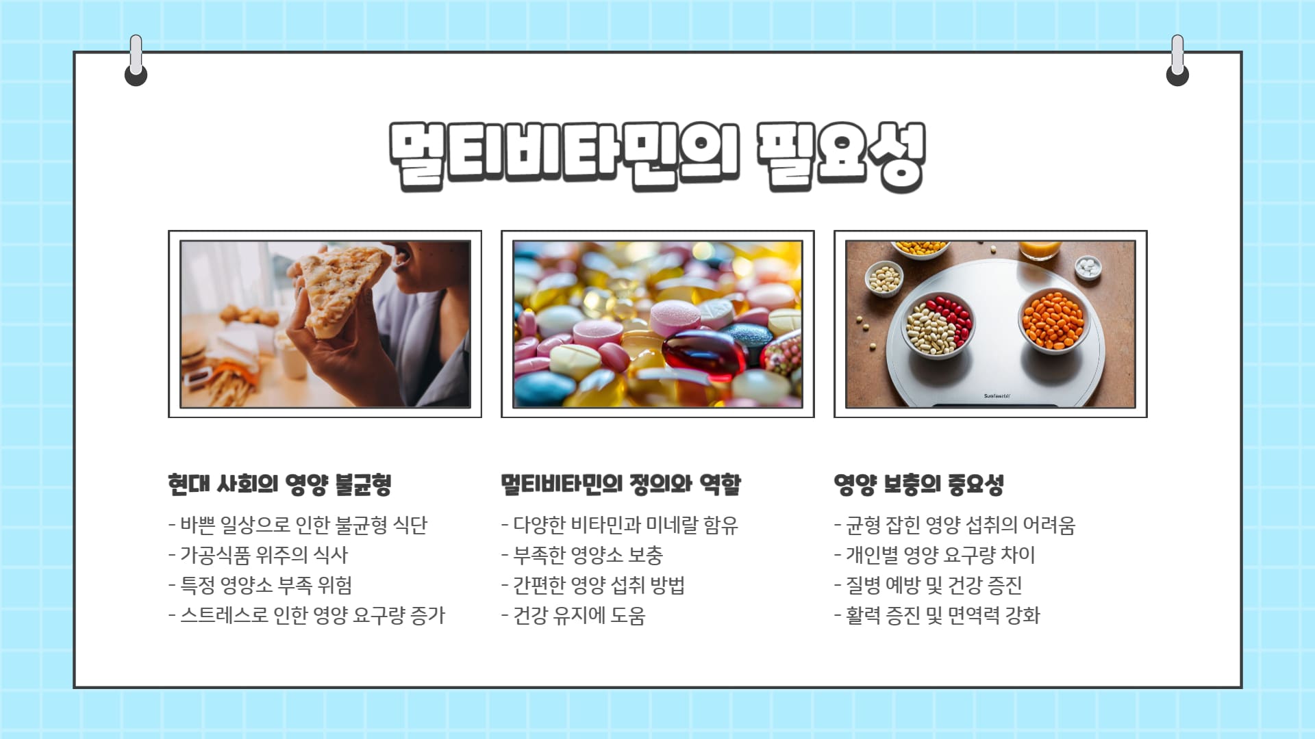 멀티비타민은 부족하기 쉬운 영양소를 간편하게 보충하는 데 도움을 줄 수 있지만, 가장 중요한 것은 건강한 식단을 기본으로 하는 것이며, 멀티비타민은 어디까지나 보조적인 역할임을 기억해야 합니다.
