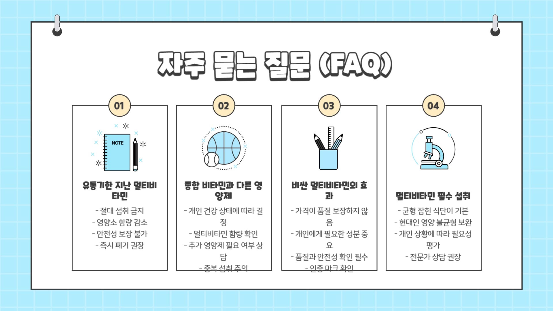 - 다른 약물과의 상호작용 주의: 특정 약물(예: 항응고제, 갑상선 호르몬제 등)은 비타민/미네랄과 상호작용할 수 있습니다. 복용 중인 약물이 있다면 반드시 의사 또는 약사와 상담 후 멀티비타민 섭취 여부를 결정하세요.