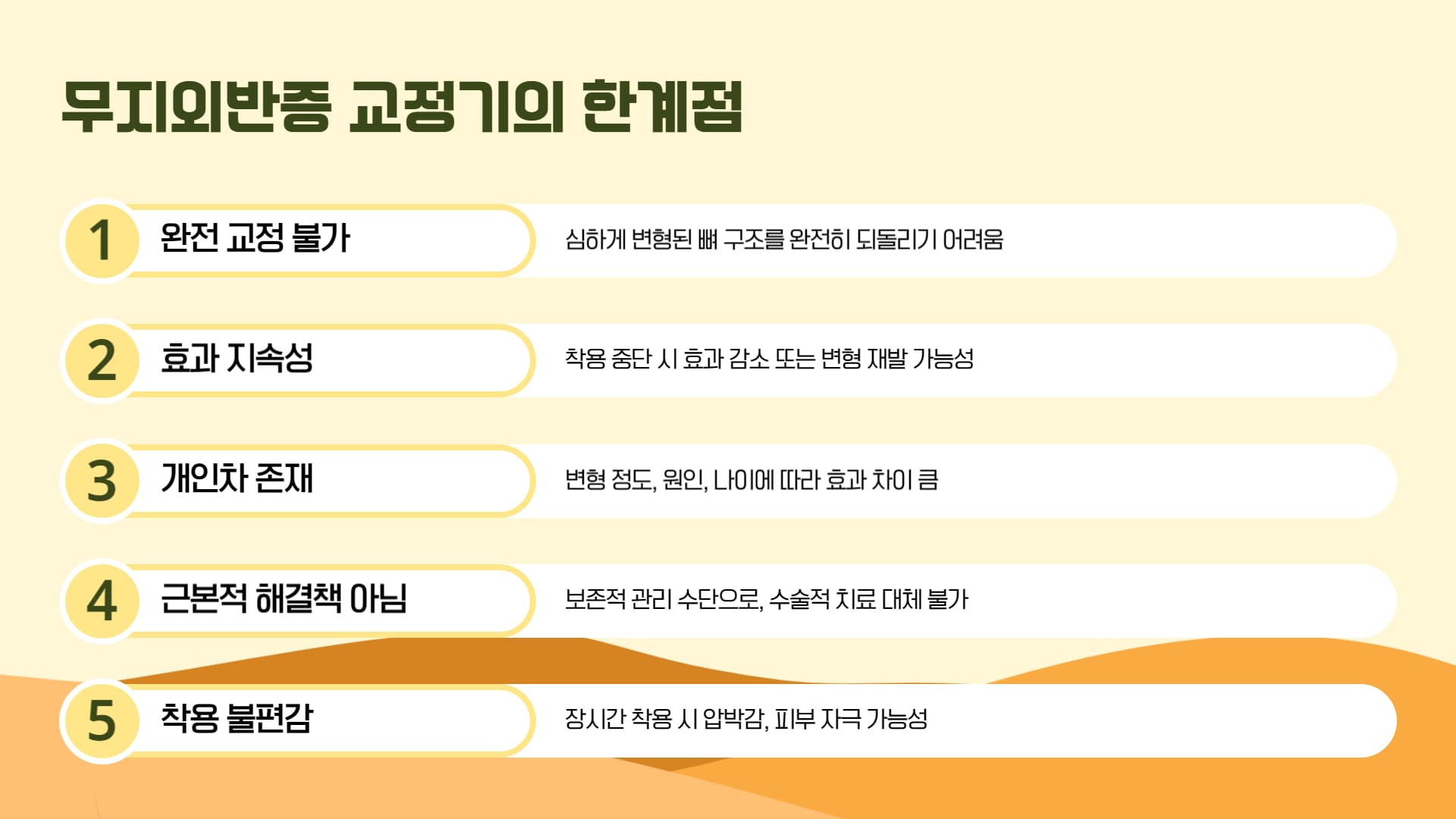 교정기는 통증 완화와 변형 진행 억제에 도움을 줄 수 있지만, 근본적인 치료는 아니므로 현실적인 기대치를 갖고 꾸준히 관리하는 자세가 필요합니다.