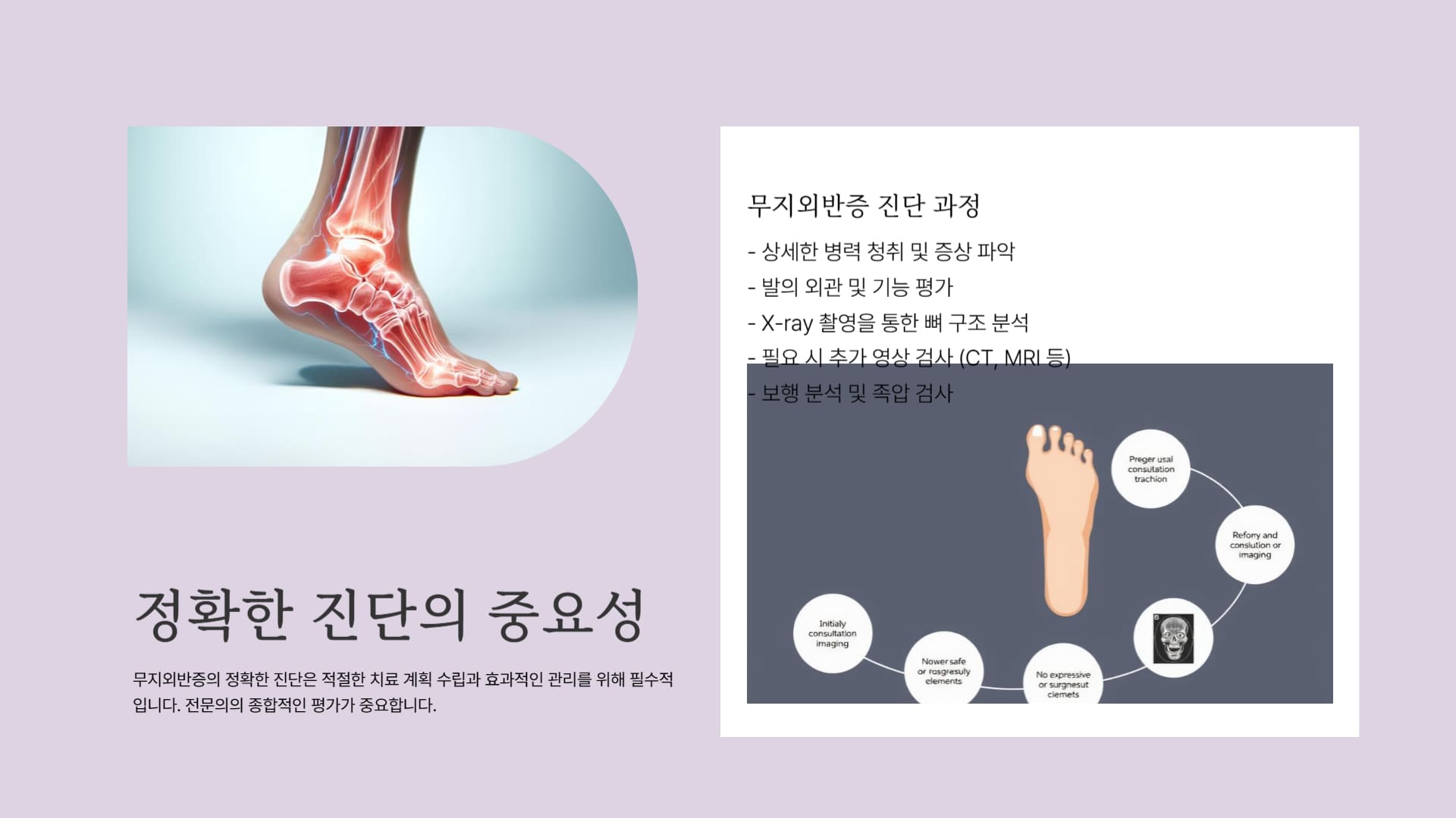 이를 통해 무지외반증의 심각도를 판단하고, 통풍이나 관절염 등 유사한 증상을 보이는 다른 질환과의 감별 진단도 이루어집니다.