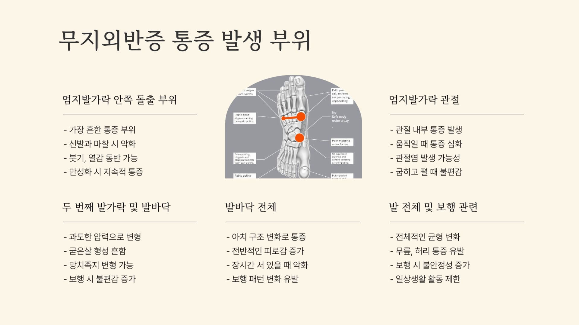 ▶ 무지외반증 통증의 주요 발생 부위 및 양상