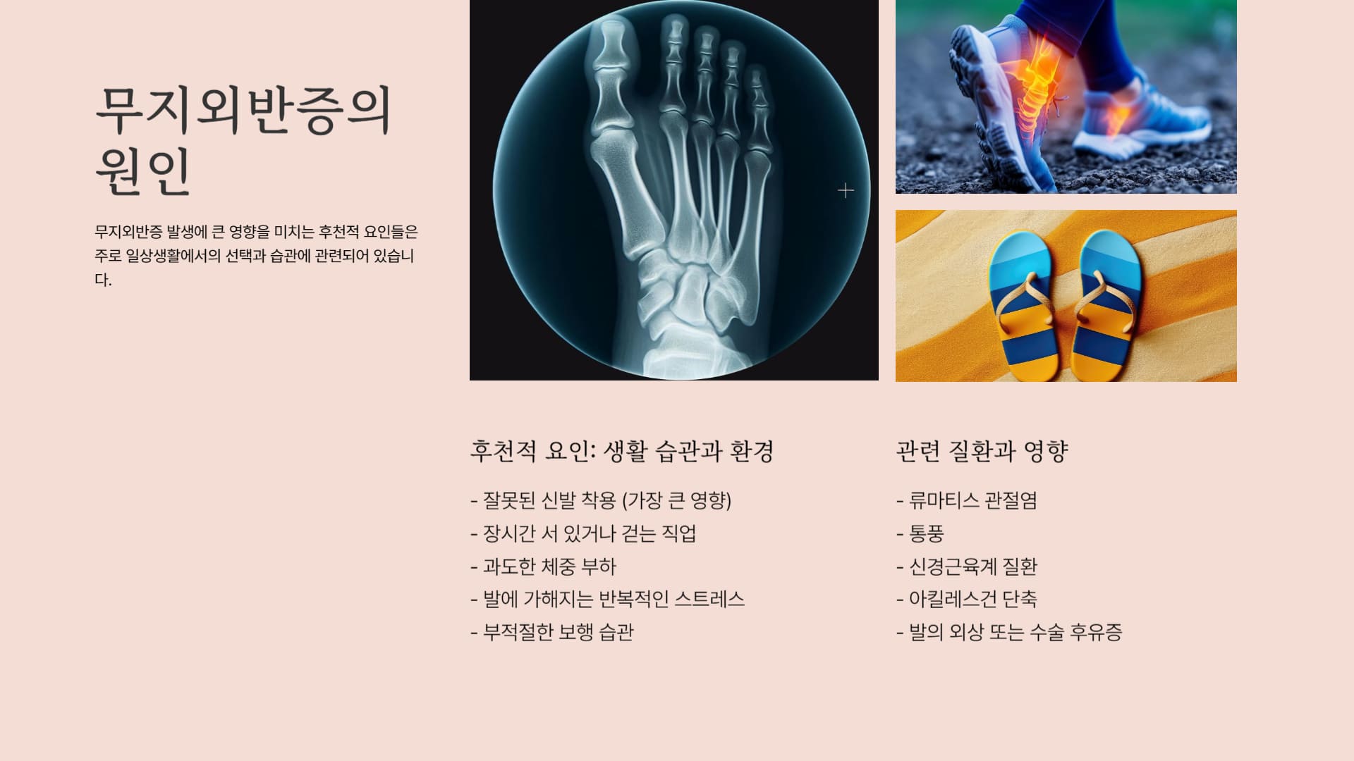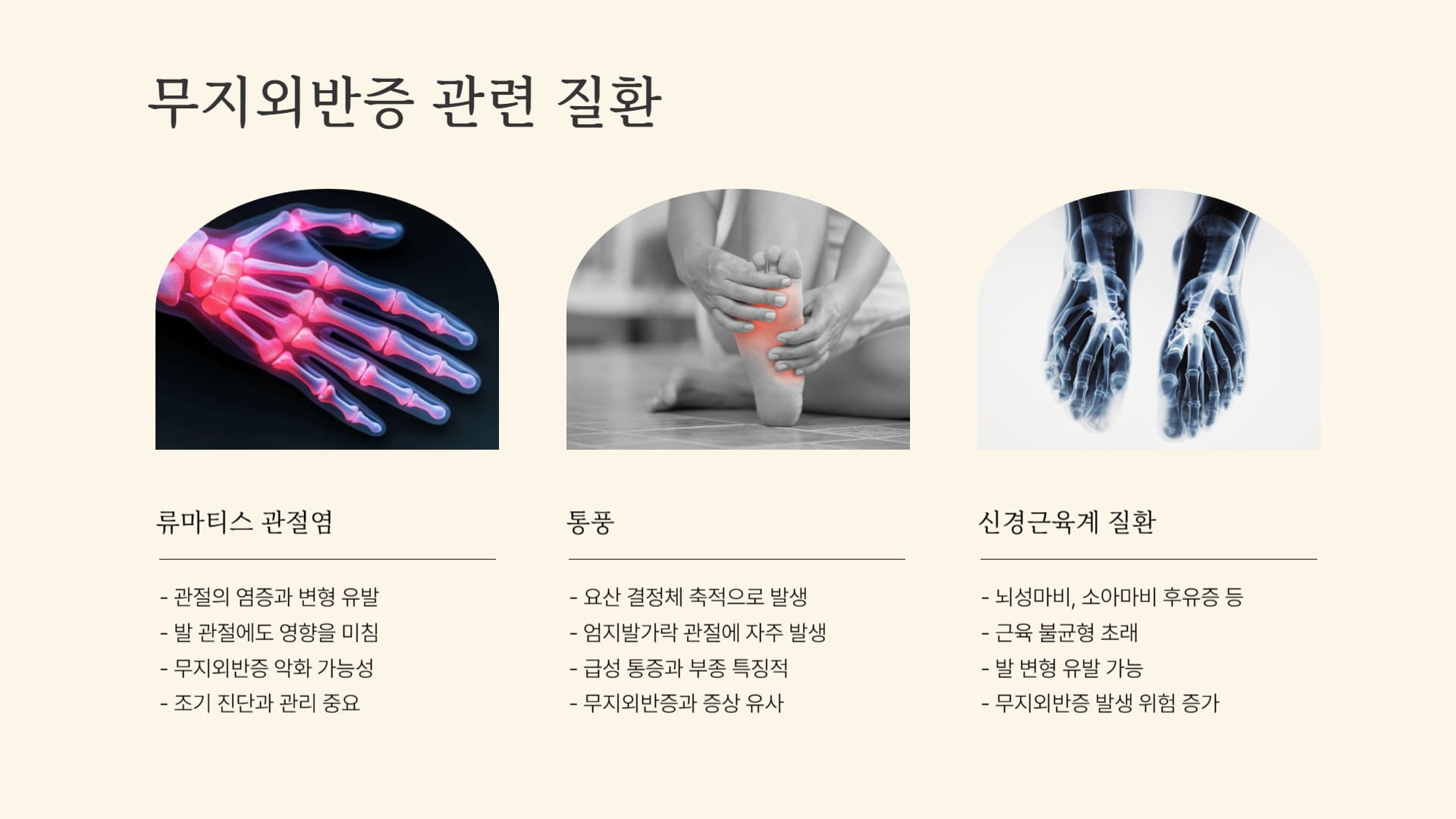 기타 질환 관련 류마티스 관절염, 통풍, 신경근육계 질환 (예: 뇌성마비, 소아마비 후유증 등), 아킬레스건 단축. 이러한 질환들이 발의 관절, 인대, 근육, 신경 등에 영향을 미쳐 2차적으로 무지외반증을 유발하거나 기존 변형을 악화시킬 수 있음. 해당 질환을 앓고 있는 경우.