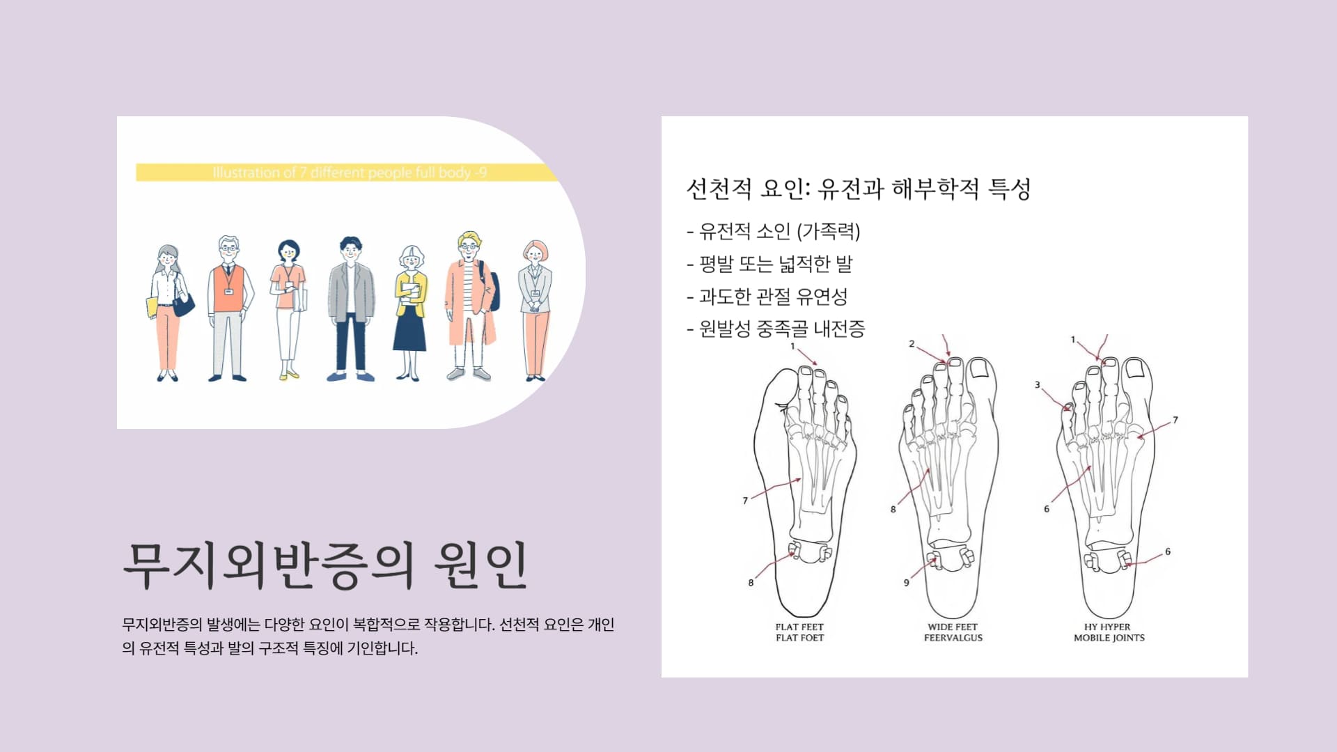선천적/내재적 요인 유전적 소인 (가족력), 평발 또는 넓적한 발 (제1중족골 내전), 과도한 관절 유연성, 원발성 중족골 내전증. 부모나 형제자매 중 무지외반증 환자가 있을 경우 발생 확률 증가. 발의 해부학적 구조(예: 첫 번째 중족골이 안쪽으로 휘는 것)나 인대의 특성이 엄지발가락 변형에 취약하게 만듦. 여성(남성보다 5~10배 호발), 특정 인종.