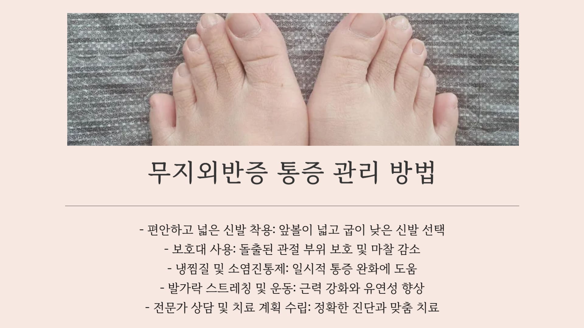 • Q3: 무지외반증으로 인한 통증은 어떻게 관리해야 하나요? 집에서 할 수 있는 방법이 있나요?