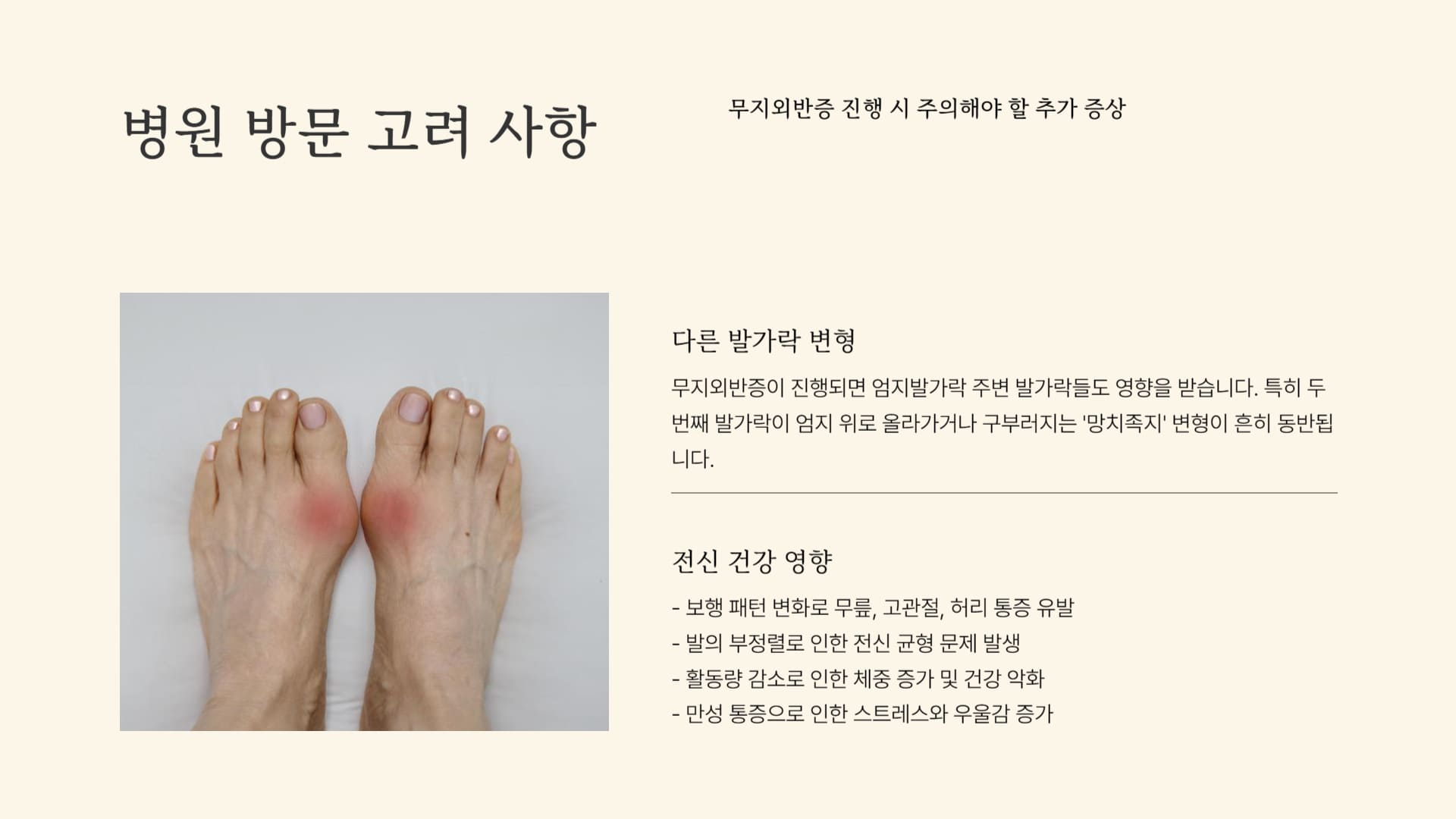 이러한 압력이 장기간 반복되면 엄지발가락은 점차 바깥쪽으로 휘어지고, 관절 부위는 안쪽으로 돌출되는 변형이 고착화됩니다.