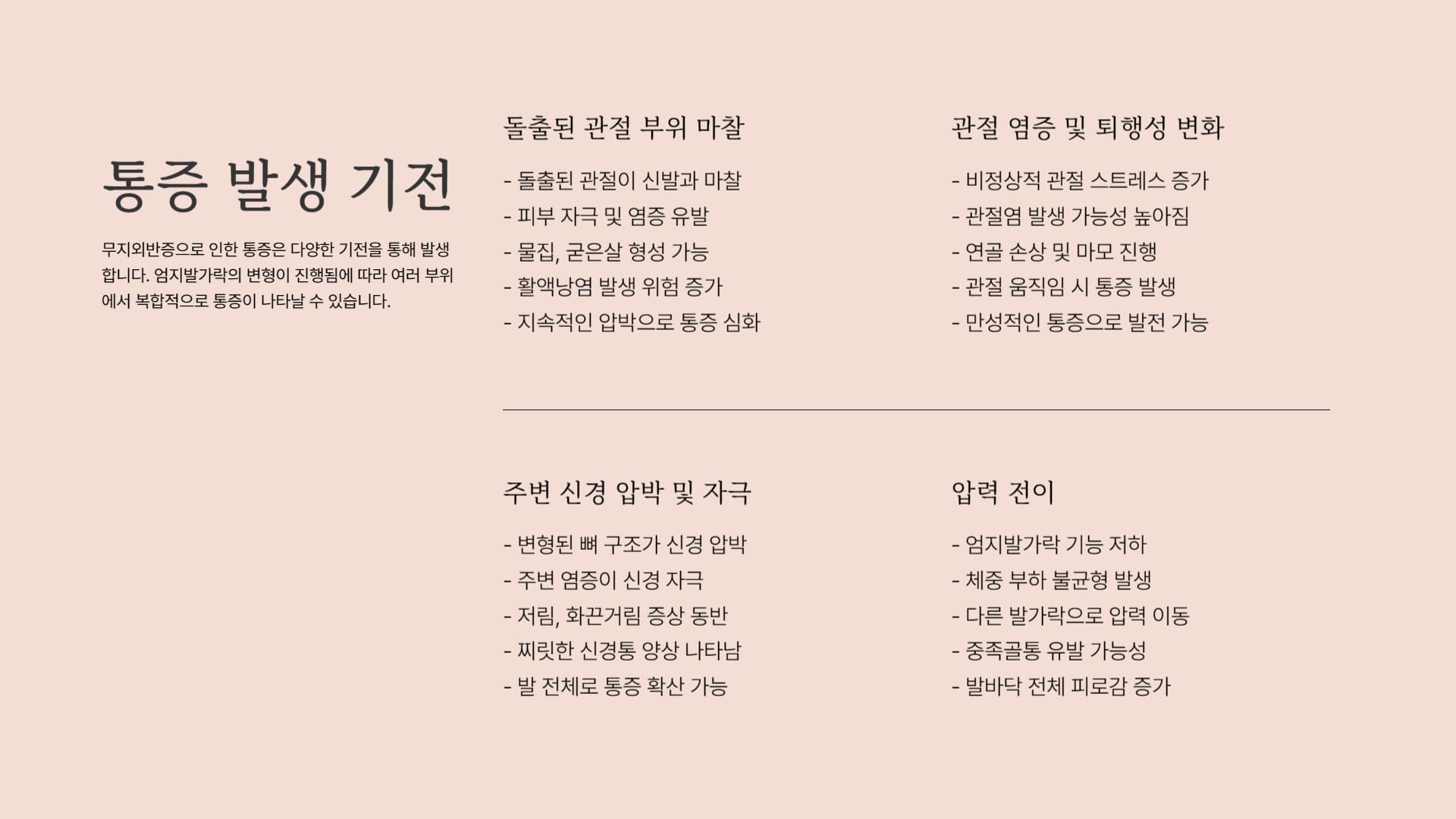 - 관절 자체의 염증 및 퇴행성 변화: 변형된 관절은 비정상적인 스트레스를 받게 되어 관절염이 발생하거나 연골 손상이 진행될 수 있습니다. 이는 관절을 움직일 때마다 통증을 유발합니다.