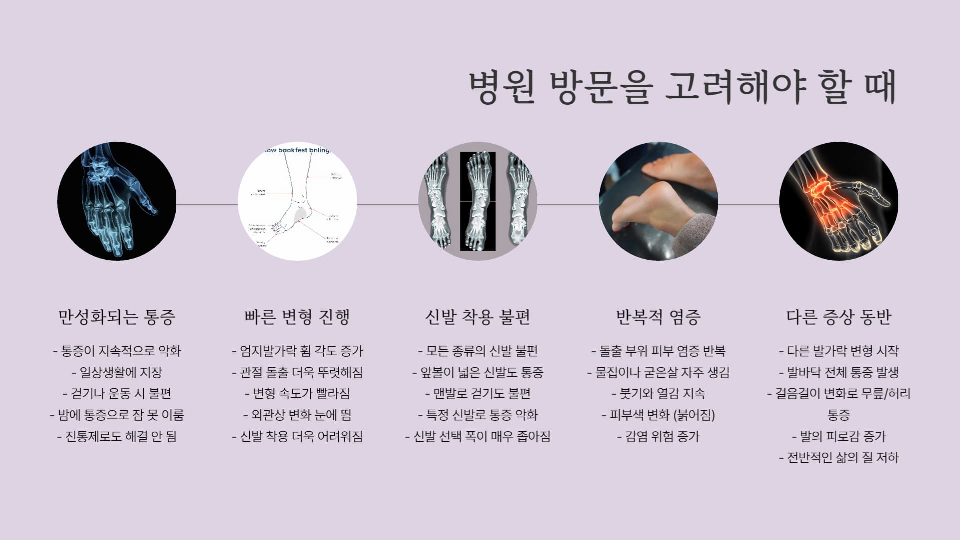 위에 언급된 항목 중 여러 가지에 해당된다면 무지외반증을 의심해 볼 수 있습니다.