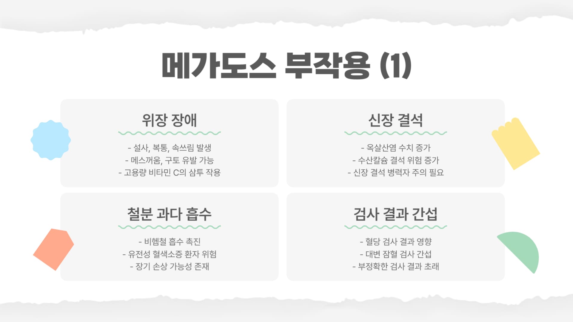 A4: 대부분은 설사 등 위장 장애와 같이 경미한 수준이지만, 신장 결석 형성이나 철분 과부하 등 개인의 건강 상태에 따라 심각한 문제를 유발할 수도 있습니다. 특히 기저 질환이 있는 경우 위험성이 더 커질 수 있습니다.