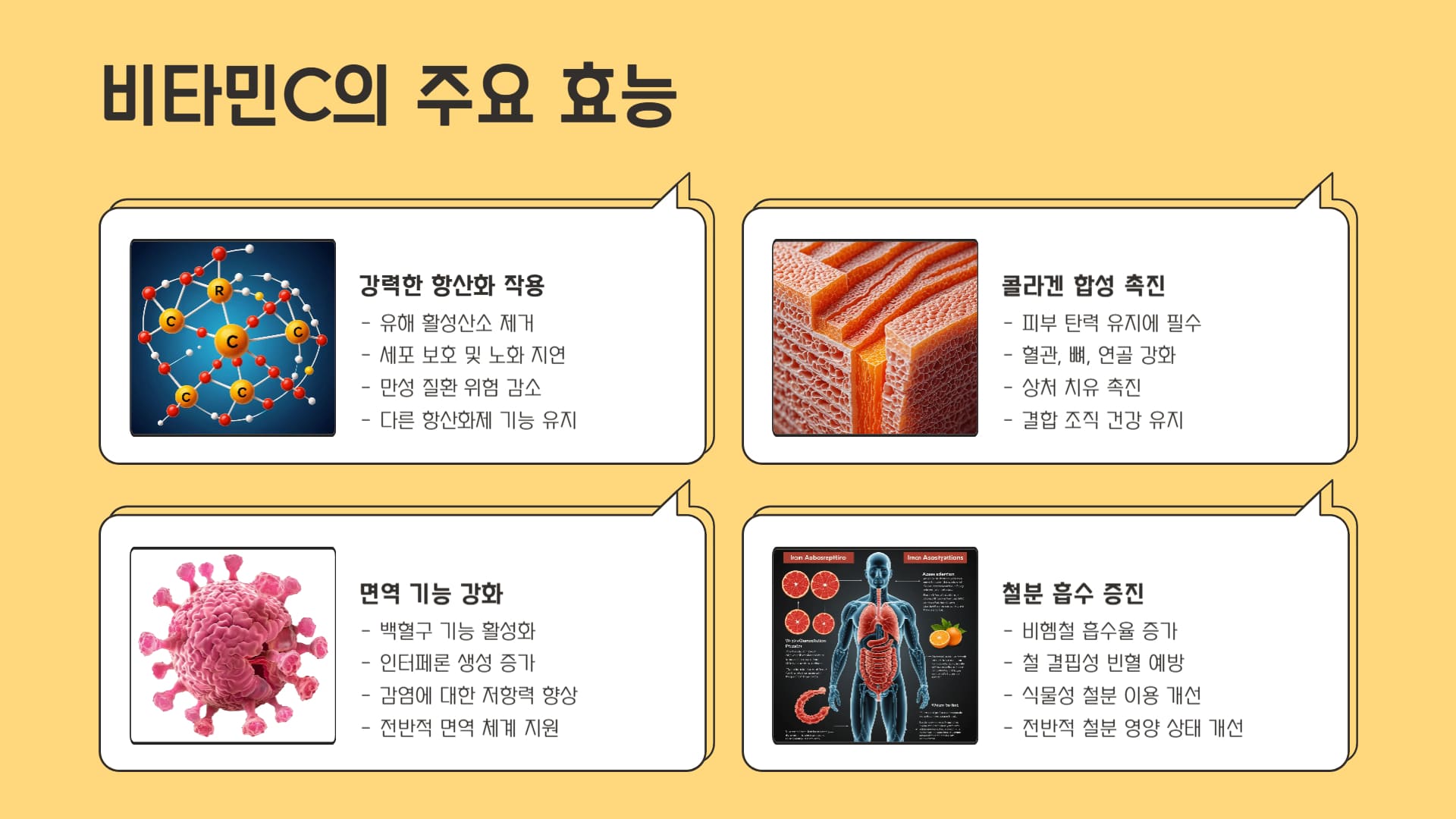 | 콜라겐 합성 촉진 | 피부, 혈관, 뼈, 연골, 잇몸 등 우리 몸의 결합 조직을 구성하는 주요 단백질인 콜라겐을 만드는 데 필수적인 역할을 합니다. | 피부 탄력 유지, 혈관 건강, 뼈/연골 강화, 상처 치유 촉진 |