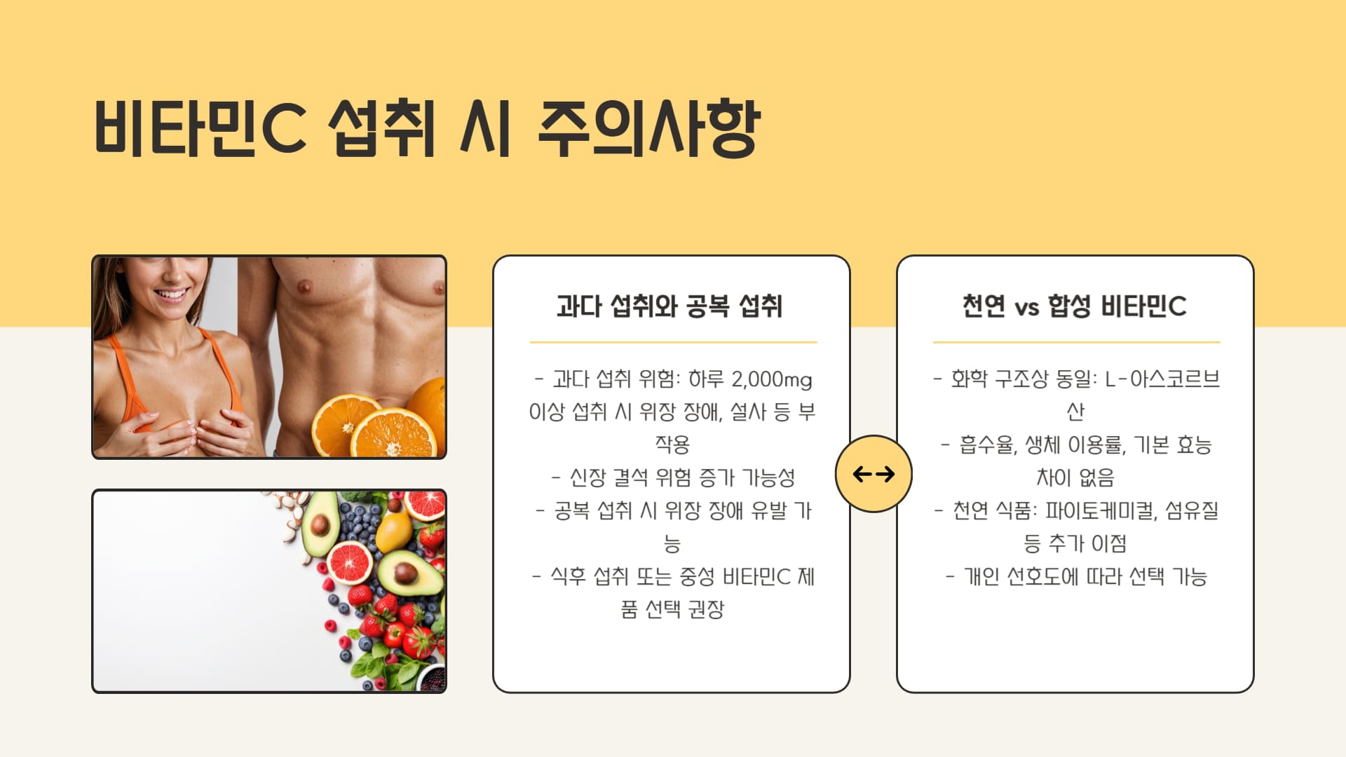 A3: 수용성 비타민이라 필요한 양 외에는 소변으로 배출되는 것은 맞지만, 하루 2,000mg(상한섭취량) 이상 과다 섭취 시 설사, 복통, 속쓰림 등 위장 장애나 신장 결석(특정 소인 있는 경우) 등의 부작용 위험이 증가할 수 있습니다. 상한섭취량을 넘지 않도록 주의하는 것이 좋습니다.