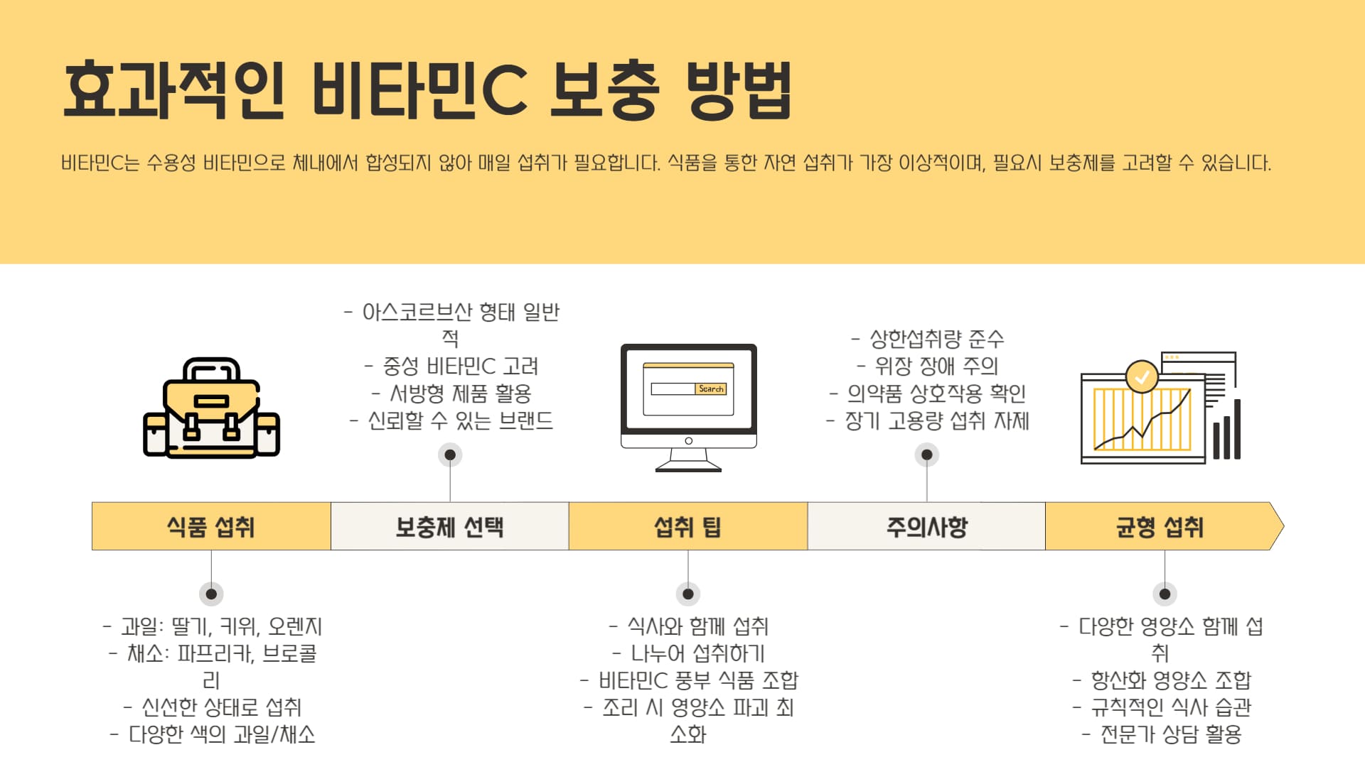 - 보충제(영양제): 평소 식단으로 충분한 비타민C 섭취가 어렵거나, 흡연 등으로 요구량이 증가하는 경우 건강기능식품 형태의 보충제를 고려해 볼 수 있습니다.