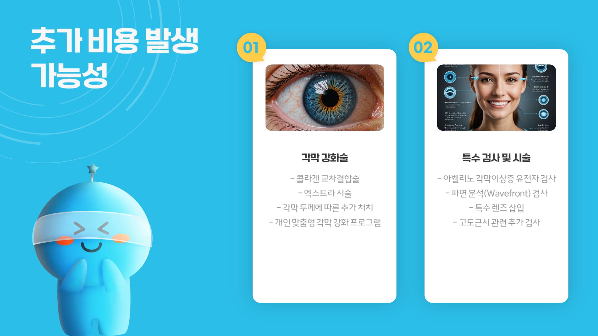 사후 관리 시스템 수술 후 정기 검진 프로그램, 부작용 발생 시 대처 시스템, 평생 관리 약속 등 수술 후 장기적인 눈 건강 관리에 중요합니다.