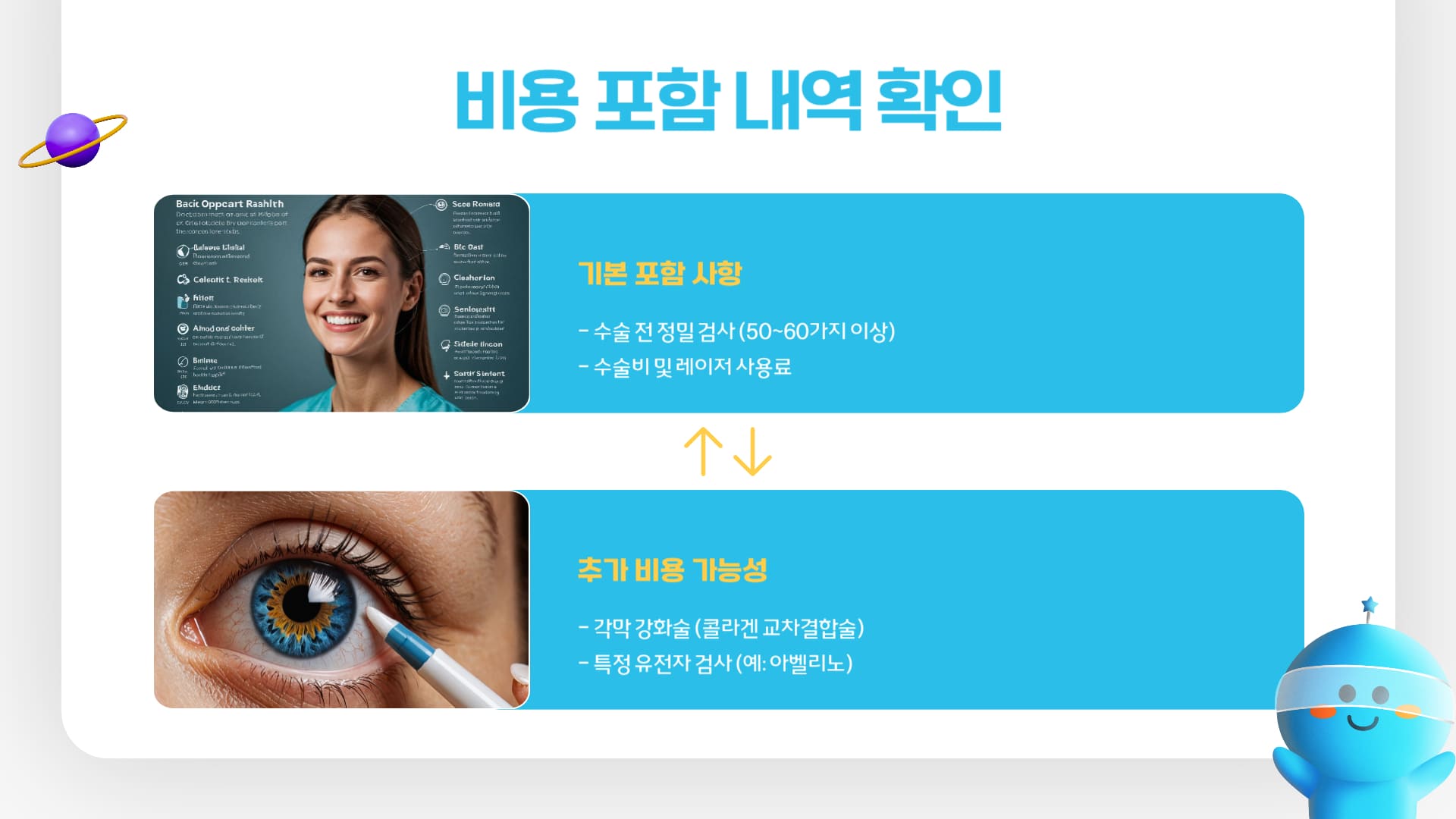 수술 비용 및 투명성 총 수술 비용(검사비, 수술비, 약값, 추가 비용 등) 명확성, 합리적인 가격대 (너무 저렴한 곳은 주의) 비용 비교 및 예산 계획에 필요합니다.